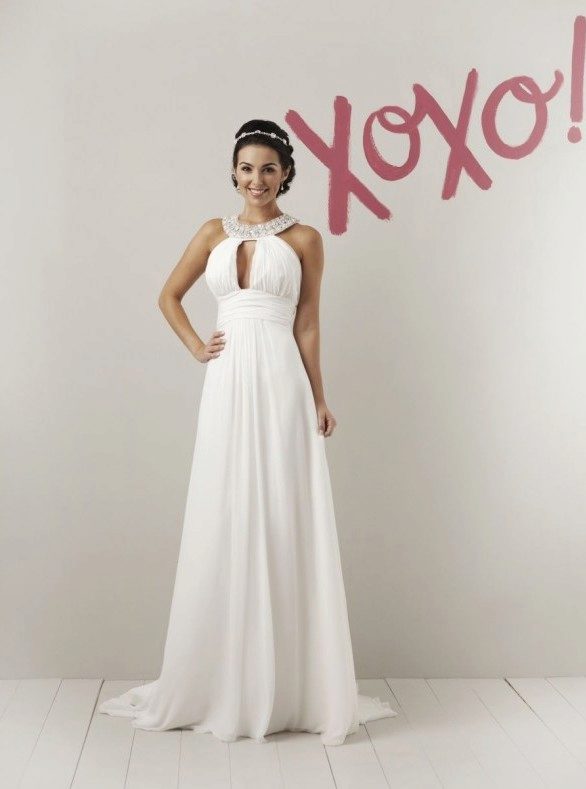 The dress with a train in the Greek style is suitable for young ladies with any figure, as the high waist helps to hide the fullness of the hips and abdomen.