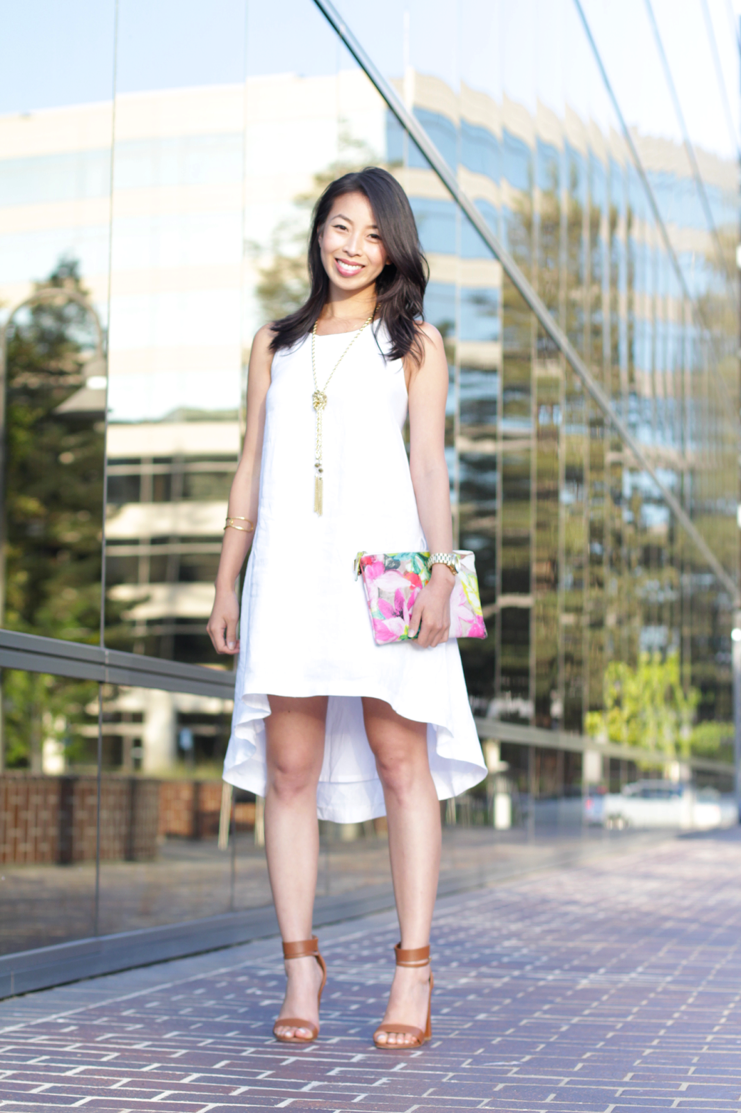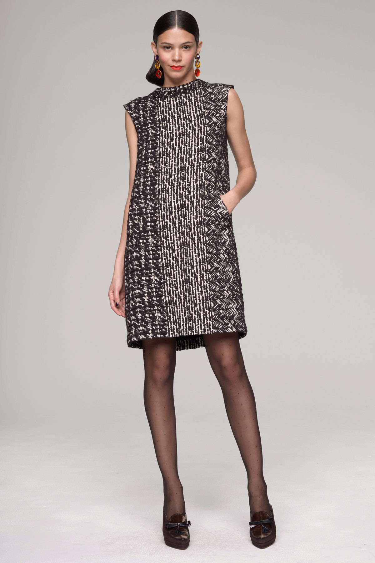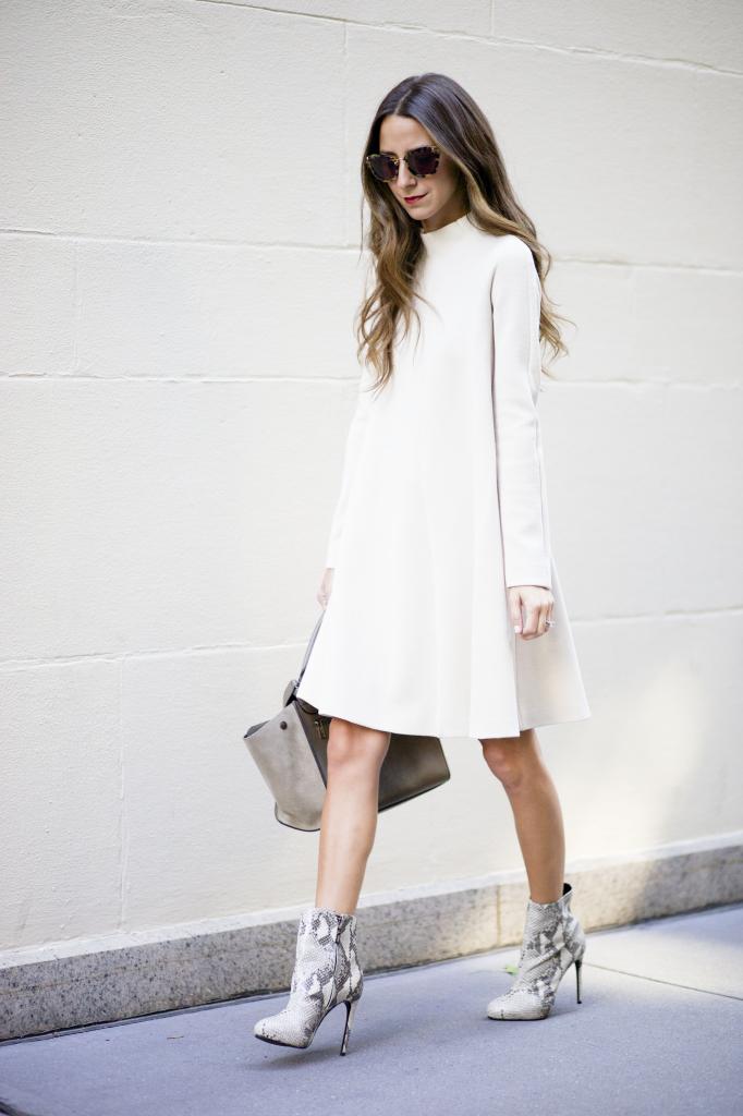 A very feminine dress, trapeze neutral shades and midi length will match the dress code of any company.