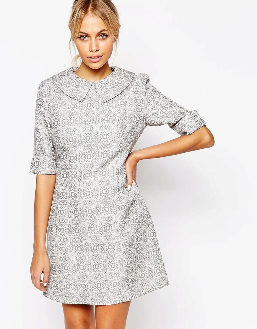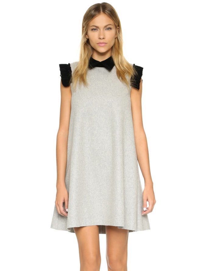 The most popular accessories of the trapezoid dress are patch pockets, embroidered embellishments, various brooches on the chest.