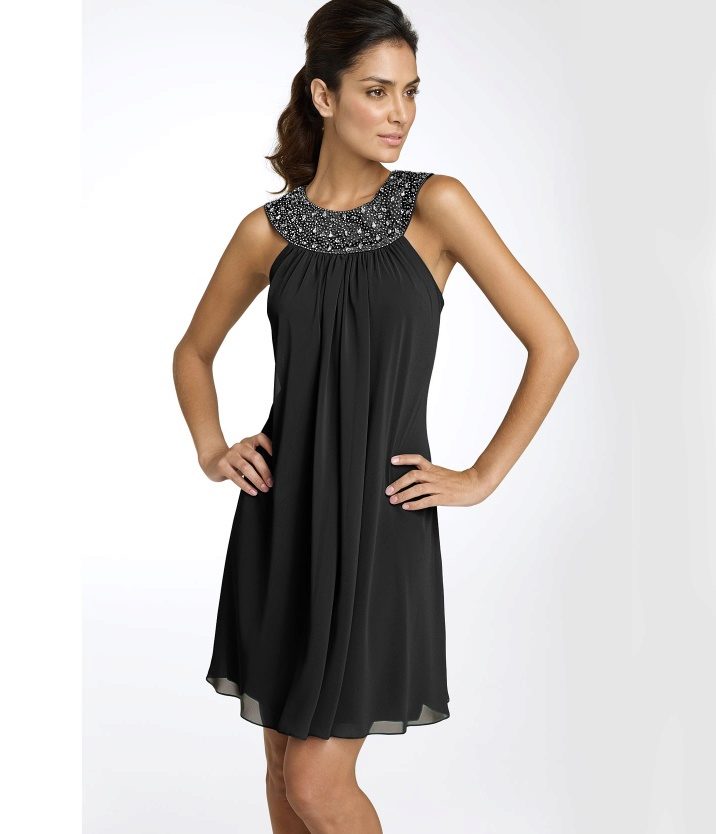 A sleeveless trapeze dress always looks exquisite. One of the options - American armhole, which will emphasize the beautiful shape of your shoulders.