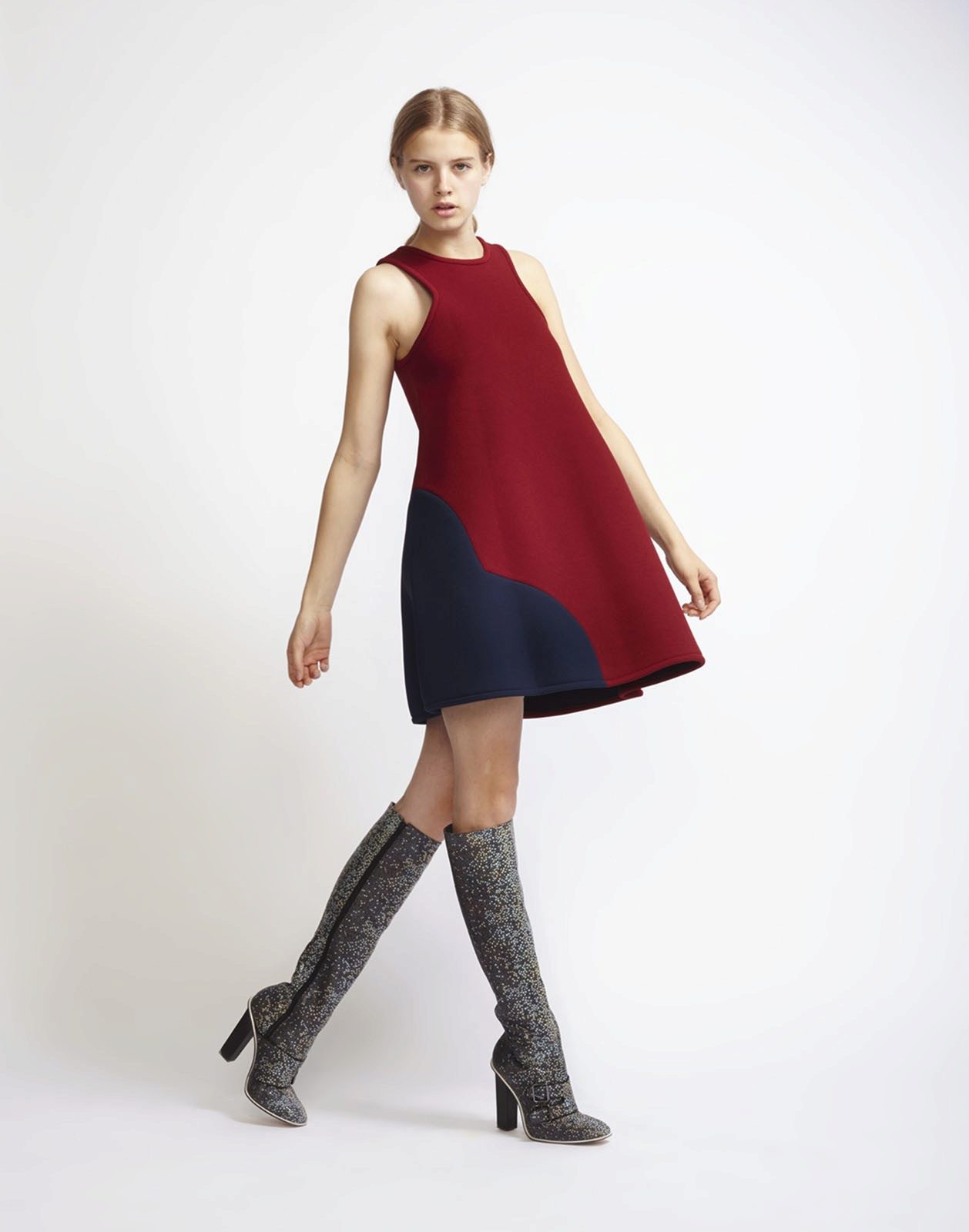 As the geometric name of this model itself says, the dress is tapered to the maximum along the shoulder line and flared to the bottom.