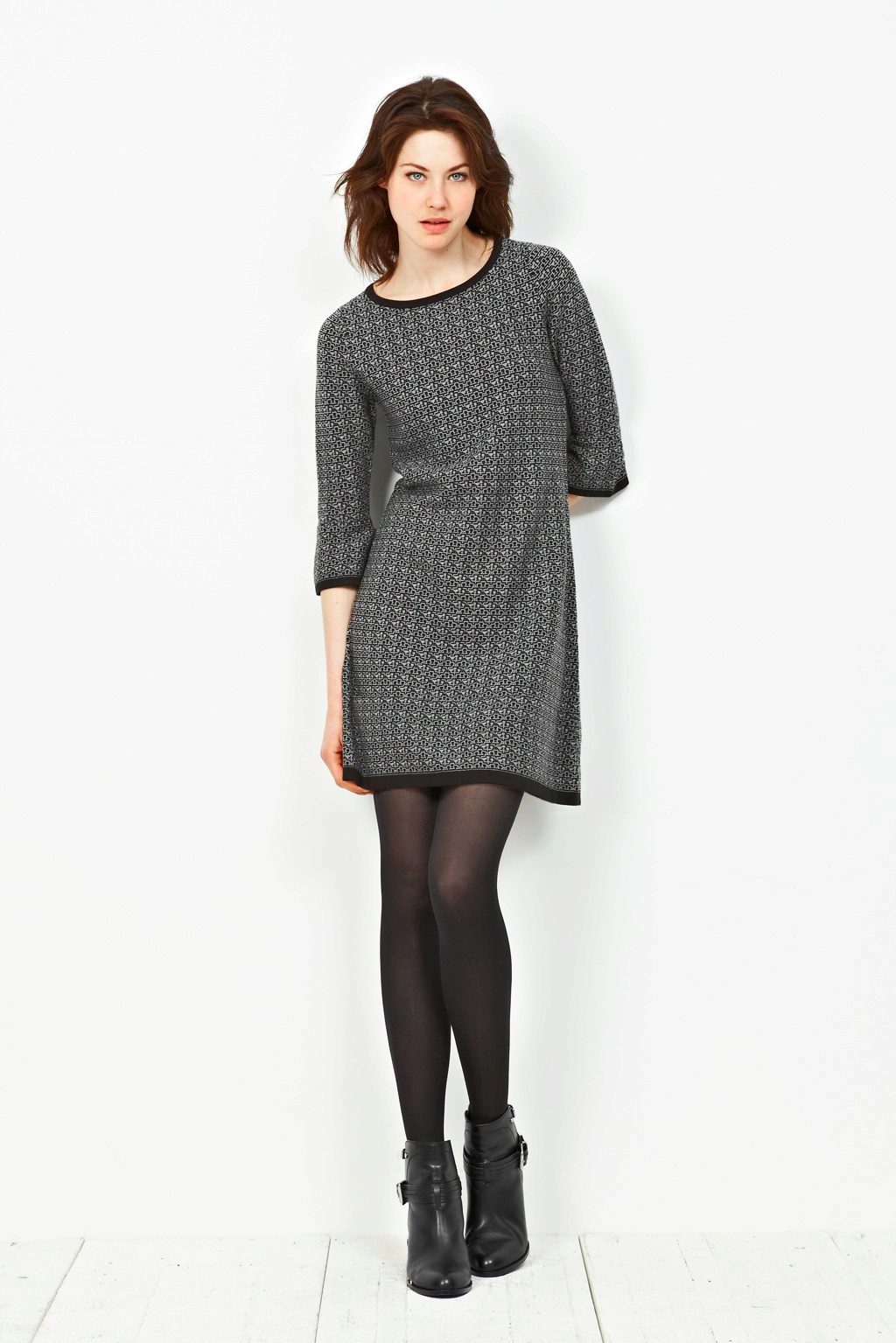 In cold weather, dresses made of wool and knitwear are in high demand. Often the models of these materials are soft and monochromatic, and their length reaches below the knees. They are combined with a jacket or cardigan, as well as boots with heels.