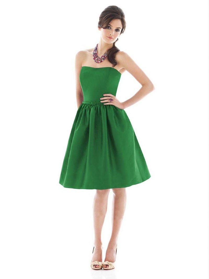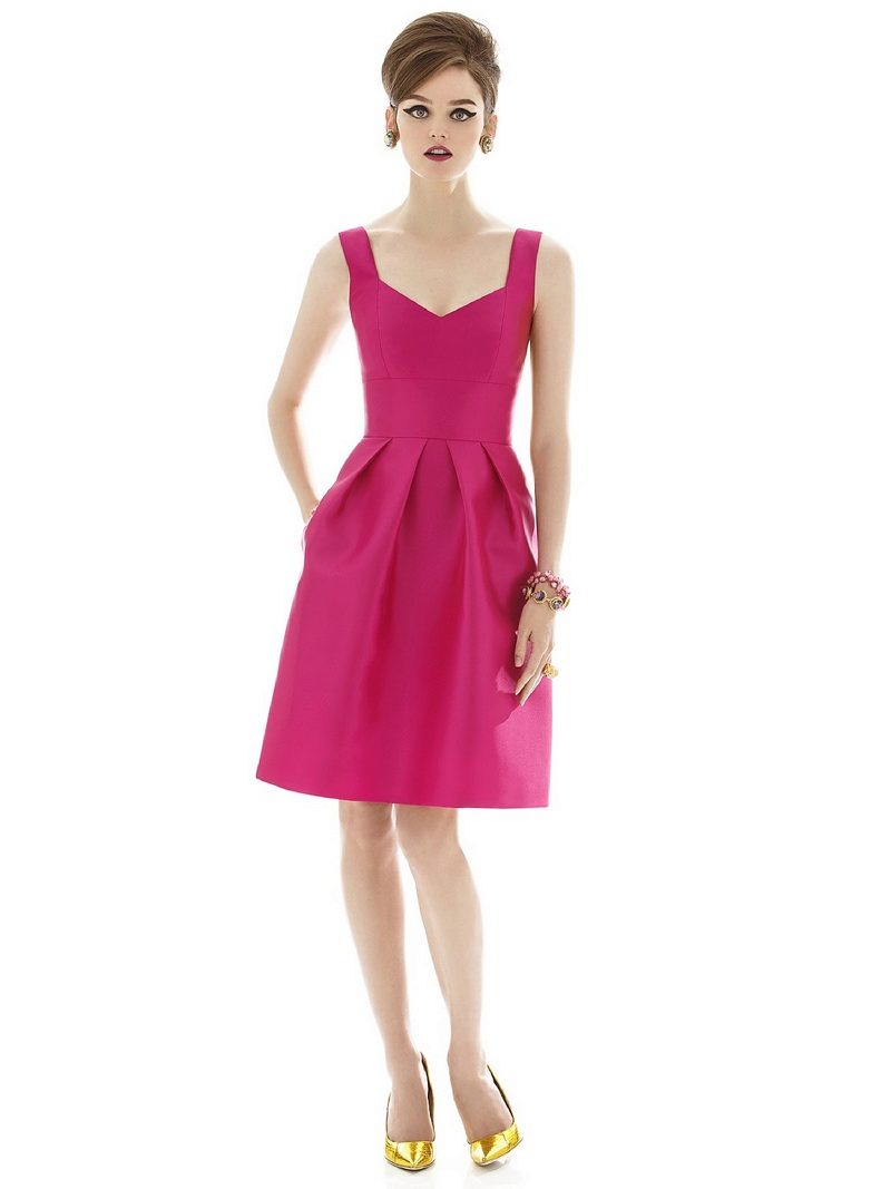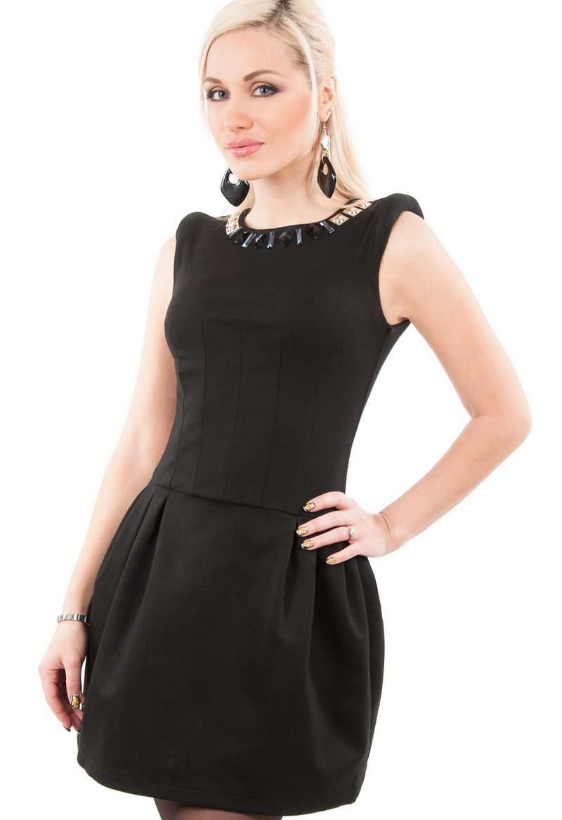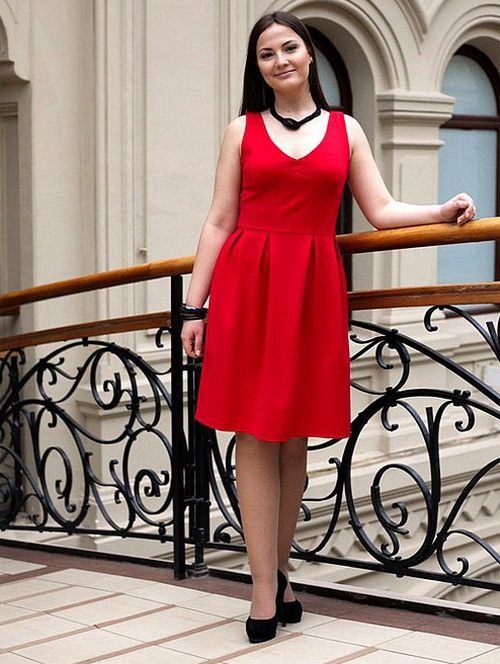 Selecting the length of the dress with a bell skirt, you should consider the appearance of the legs of the girl. The slimmer and more attractive they will be, the shorter the dress you can buy. As for the cut, first evaluate the upper part of your body. If your neck can be called neat, and your hands are beautiful, you can safely pick an outfit with a deep round, triangular or square neckline. If your bust is small, look at the models that have a bright top and have a decorative trim in the neckline.