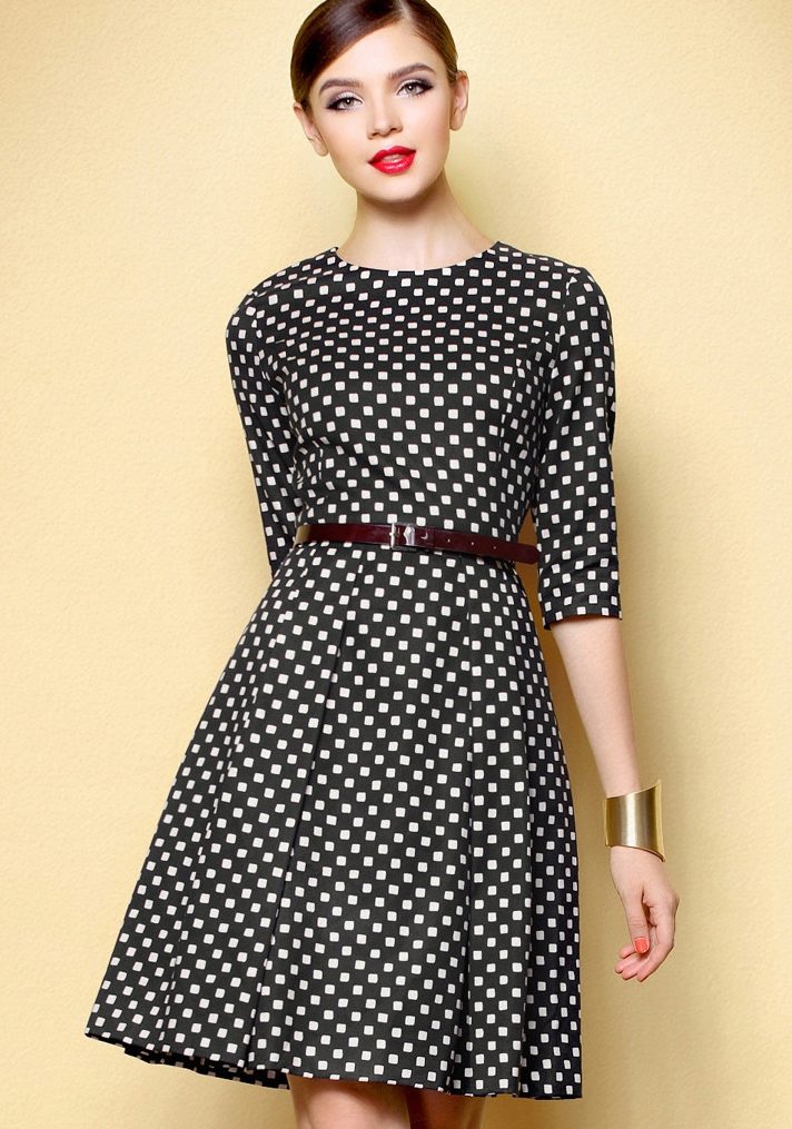Dresses with a semi-sun skirt can be of any length: there are models in the floor, midi, as well as very short dresses. The most popular models today are of medium length, with a dense bodice, a semicircular neckline and long sleeves. Such dresses in retro style look very cute and romantic. They are sewn from dense fabrics that keep their shape well.