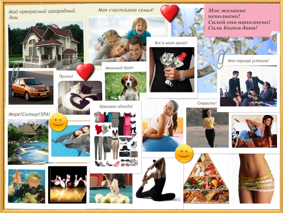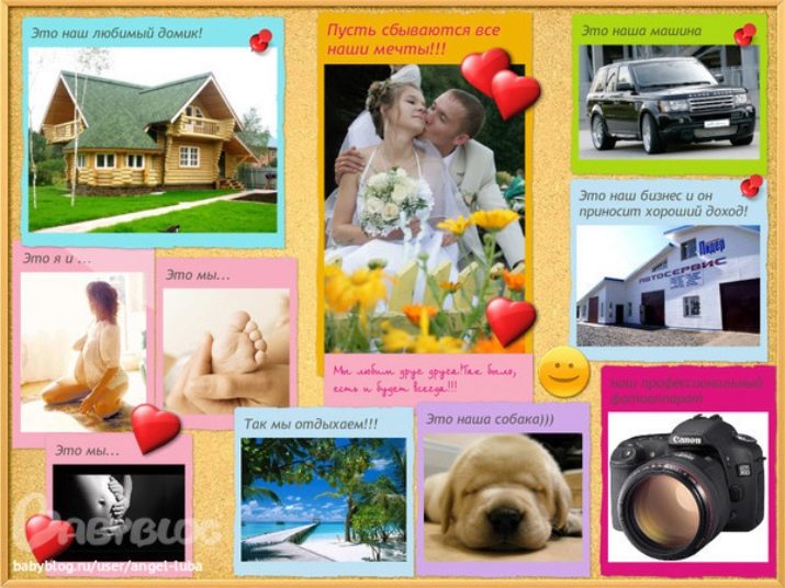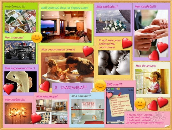 It is also important to maintain harmony. Try to have all your images decorated in the same style (or, for example, in the same color scheme). Thus, according to the results of your work, you will receive not a scattered set of visual images, but a complete picture of your future life.