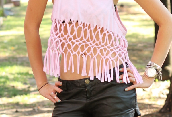 To create a new model, do not be afraid to experiment using scissors. You can cut the bottom of a T-shirt into thin strips, and then merge them into several rows. Get a spectacular pattern.