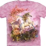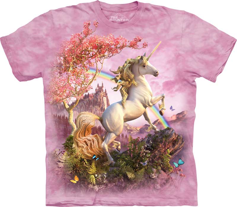 - Romantic model from The Mountain: a pink dream t-shirt with a fabulous unicorn, a rainbow, a flowering tree and a magical castle. Price - 1399 rubles.