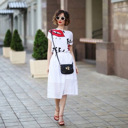 - T-shirt with a bright pattern in combination with a snow-white suit, consisting of short shorts with rivets and a fitted jacket. Complement the image of a silver bag and comfortable shoes with a small heel.