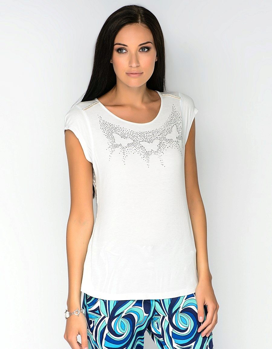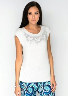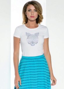 T-shirts decorated with rhinestones are an excellent option for fashion events and discos. Especially if they are combined with the right bottom.