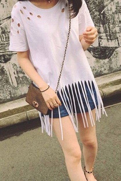 Fringe is another relatively new piece in the fashion world. She also did not avoid white t-shirts. The bottom of a T-shirt or sleeve can be decorated with a fringe. This is a particularly spectacular model, demanded by celebrities.