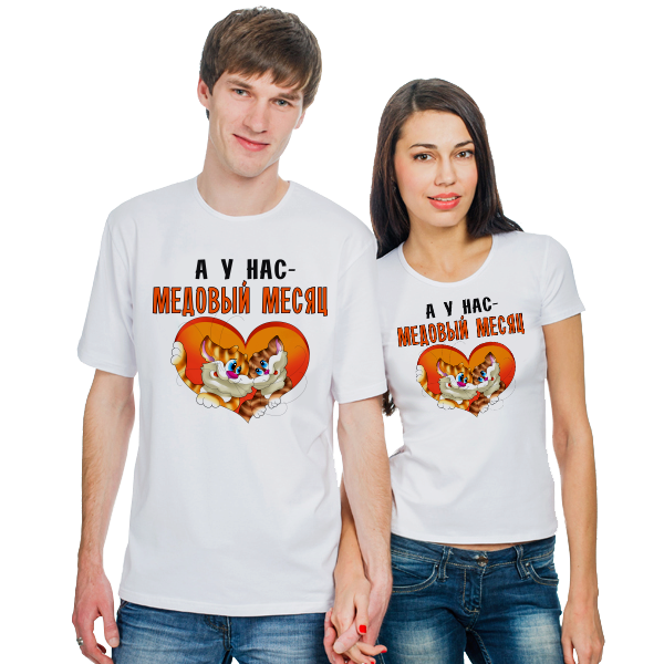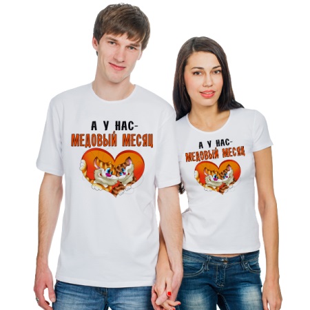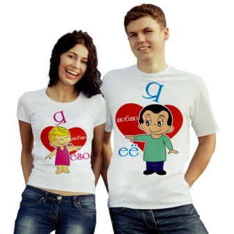 In addition to the inscriptions and hearts on the personalized T-shirts for lovers, they often depict funny schematic silhouettes of a boy and a girl, as well as famous pair characters from comics and cartoons (for example, a couple of Love is ... chewing gum inserts).