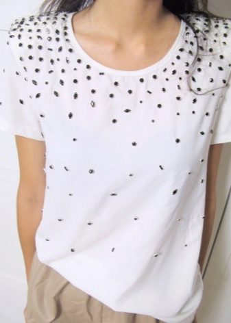 - With rhinestones and sequins. Rhinestones are a capricious accessory, so you need to gently iron the T-shirt from the wrong side, then the front part is steamed.