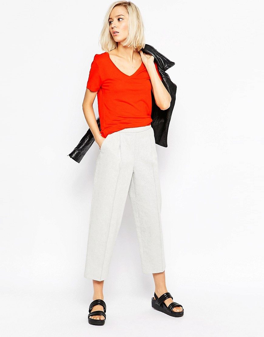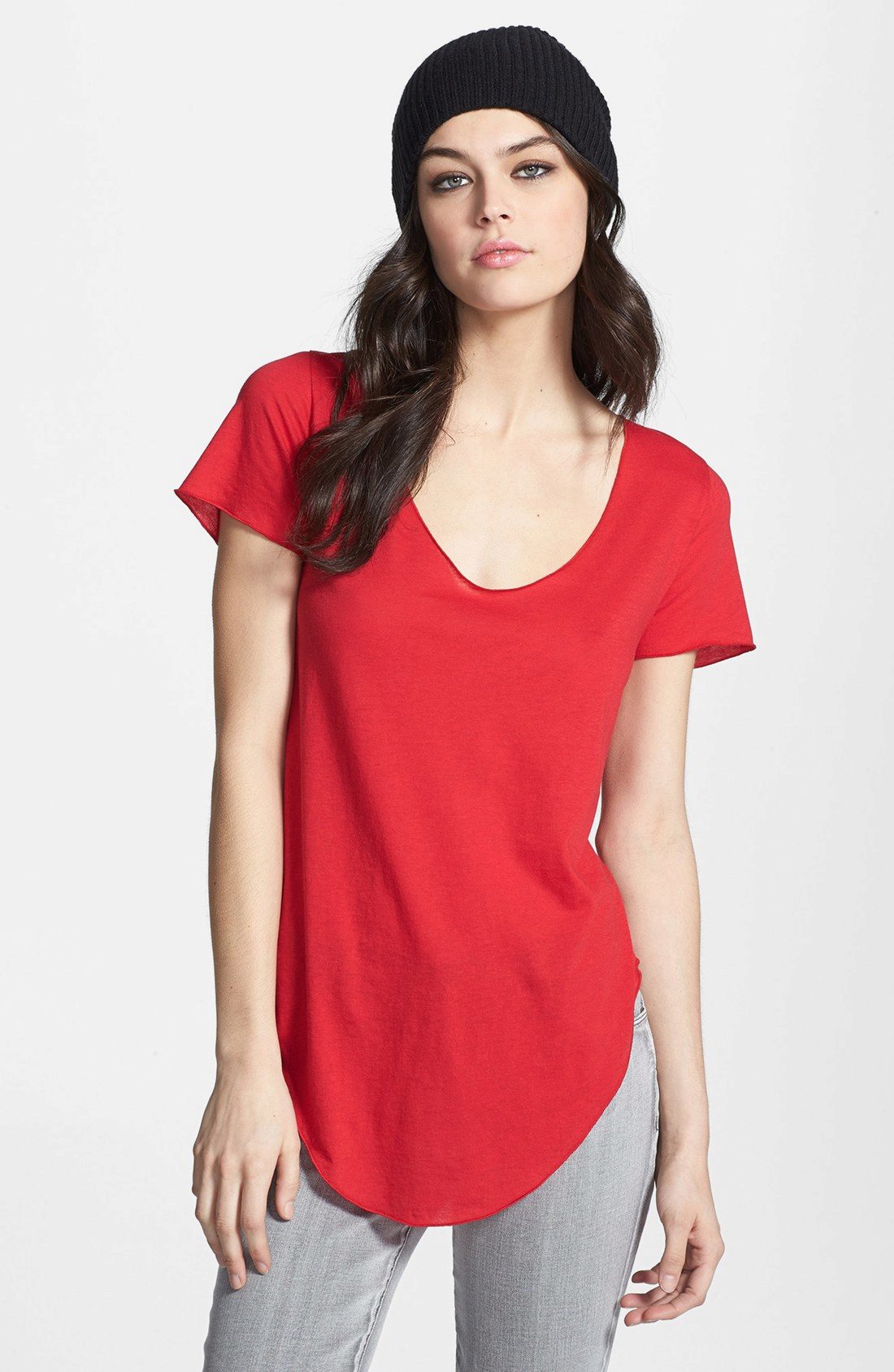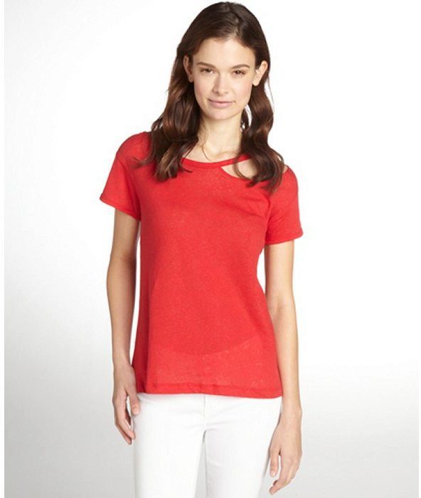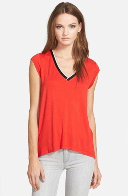 - Red T-shirt with white pants. Unusual V-neck T-shirt looks very feminine with white pants.