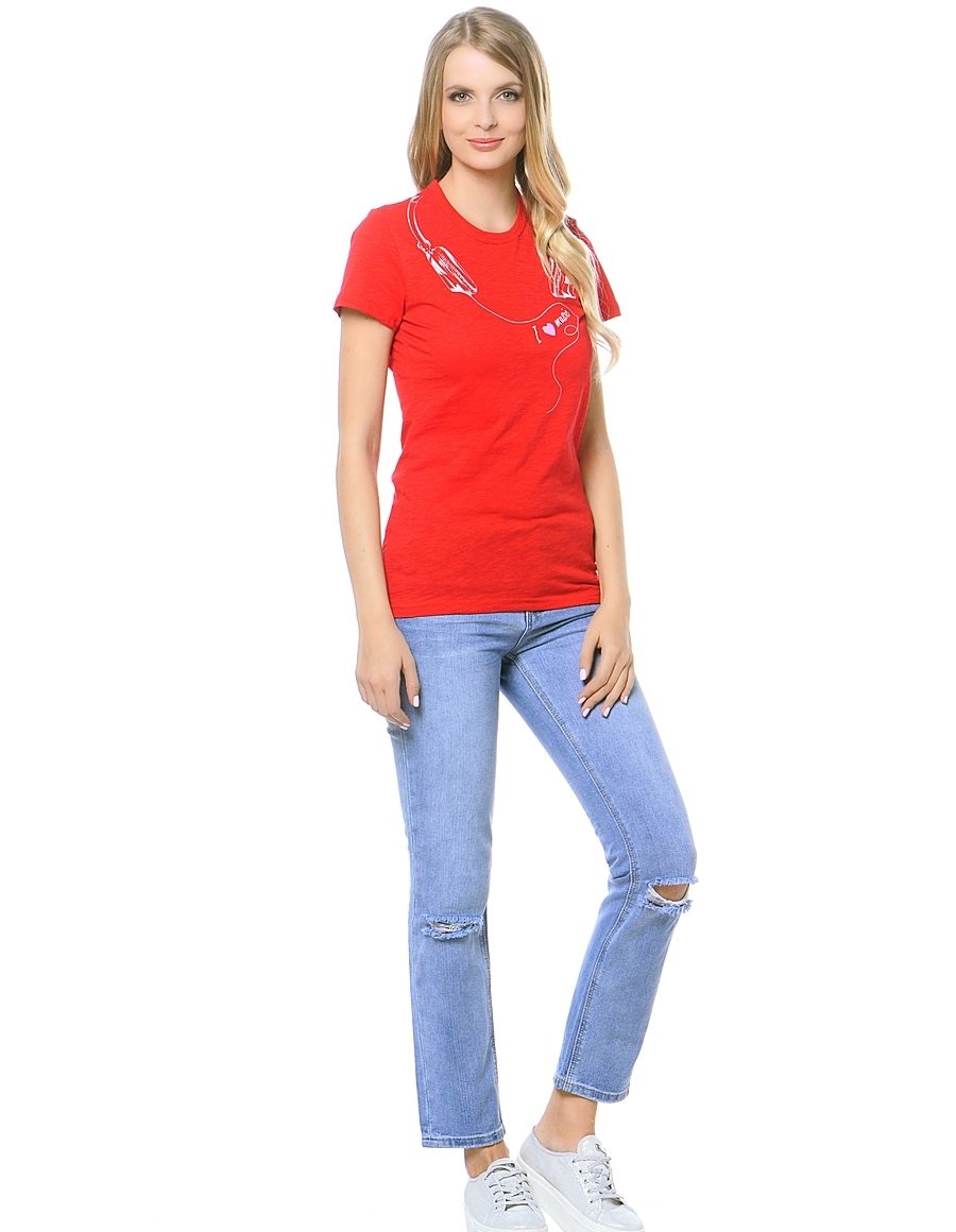 Do not forget the accessories. Despite the fact that we already have a red T-shirt, we can choose red accessories. For example, earrings or bracelet. The gold-colored decorations, white or black over the T-shirt look great.