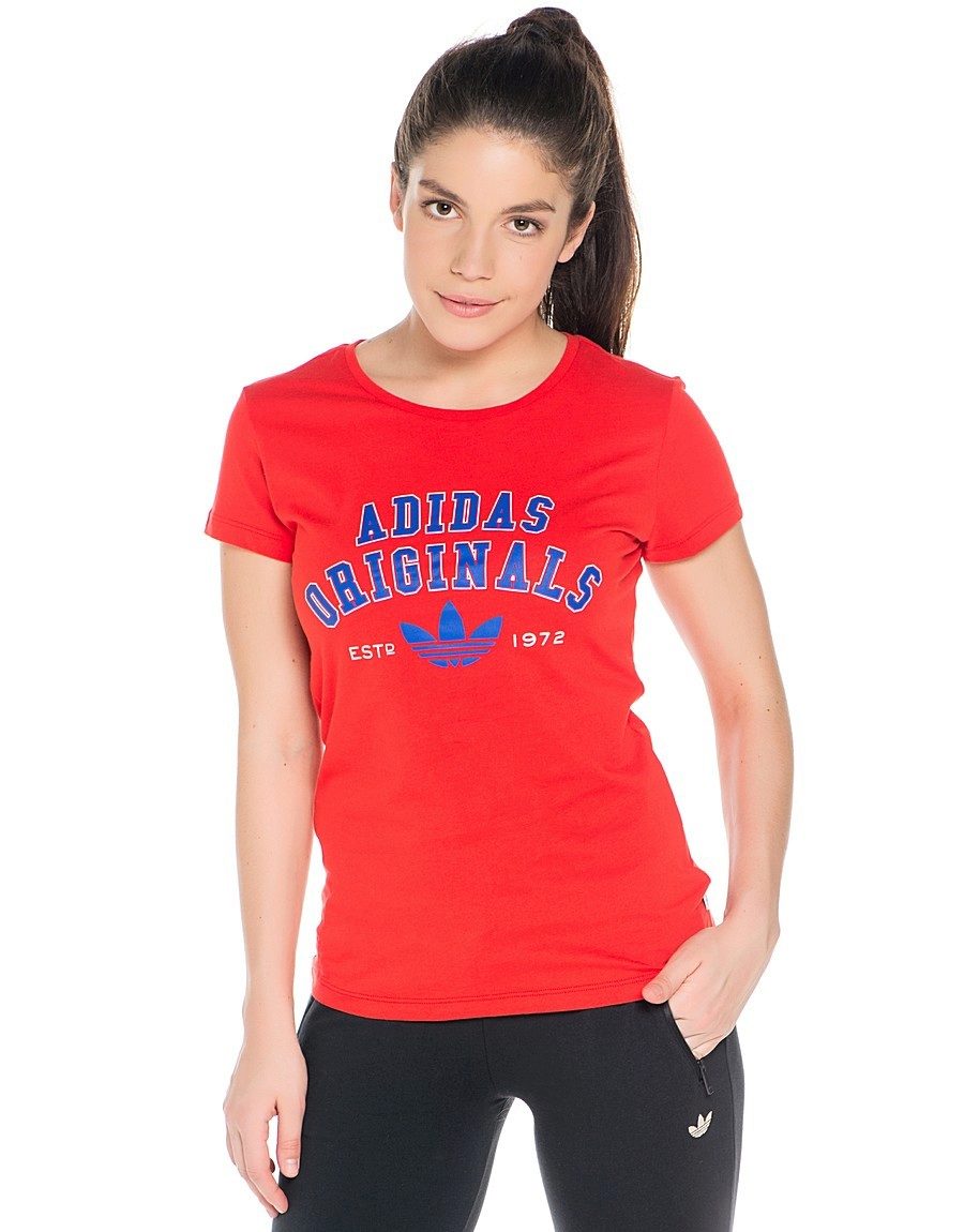 Red T-shirt is suitable for sports. Combine it with black breeches or leggings. Complement fashionable sneakers or sneakers.