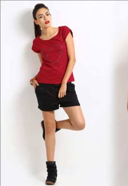 - Burgundy T-shirt with black shorts. The image is suitable for parties in the fresh air. The effect is given by rhinestones. Decorating t-shirt. Shoes - sneakers.