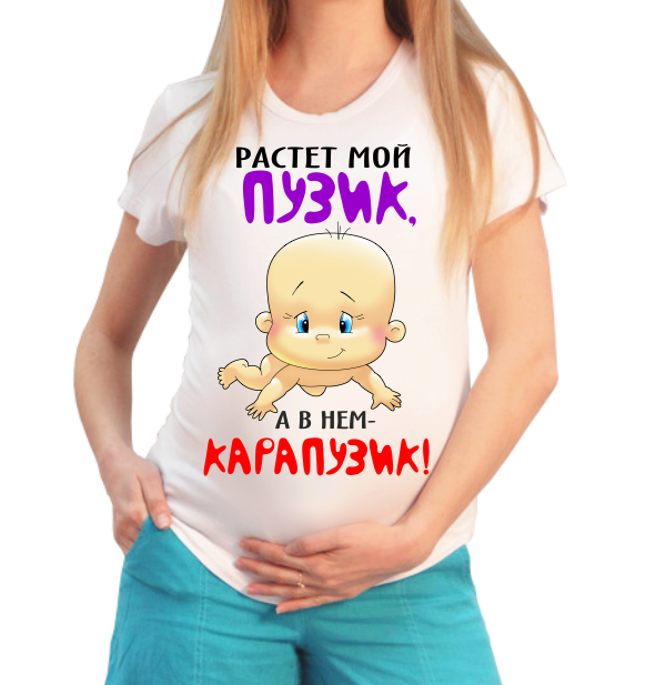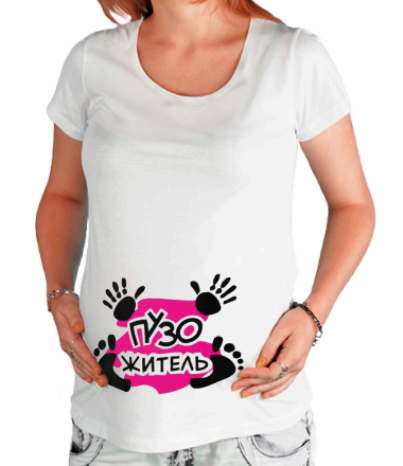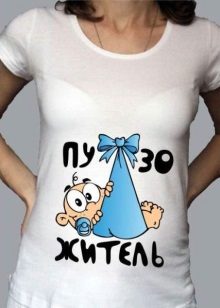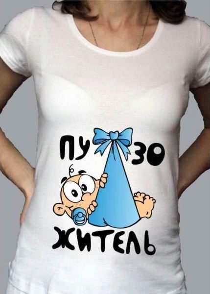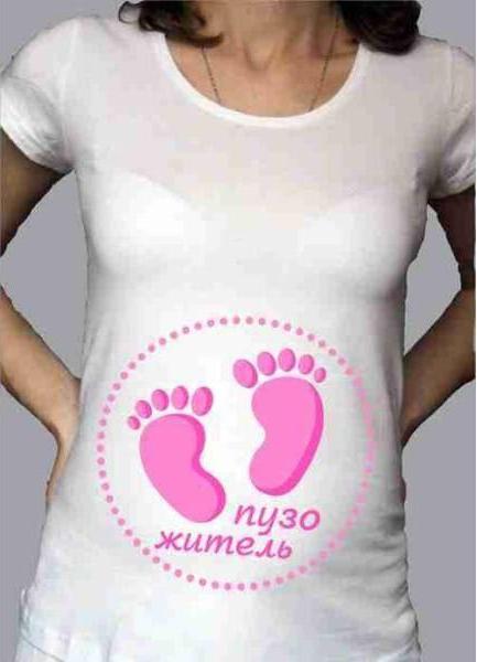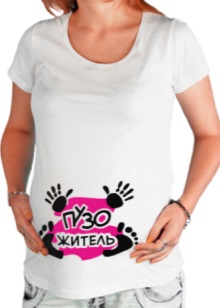 "Puzozhitel". T-shirts with this sweet and kind lettering are especially popular with pregnant women. Most often, such a playful nickname is accompanied by a cheerful, bright picture depicting a sleeping baby with a smile on his face. Different variations of such a T-shirt may contain pictures with the image of small heels and palms of a baby.