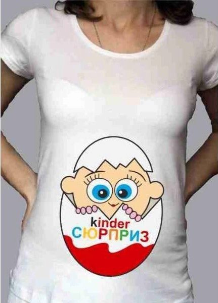 "Kinder Surprise". Another popular option for a future mom. T-shirts with neutral lettering are usually chosen by women who do not yet know the sex of the unborn child. The inscription may be accompanied by a thematic picture, drawing an analogy with a popular and beloved delicacy. Only instead of a toy from a chocolate egg a baby face looks out.