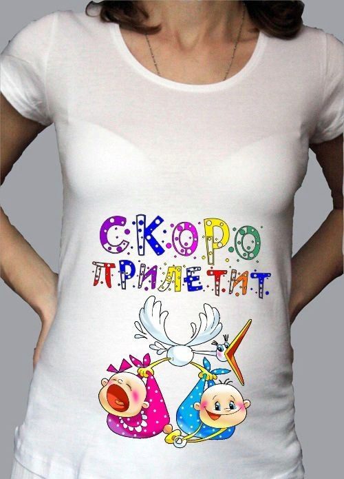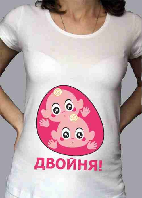 T-shirts for expectant mothers awaiting twins. Such T-shirts often depict a stork carrying two bags with babies. Another option - two children's faces on a bright background with the inscription "twins". This may be the image of two hearts of blue and pink.