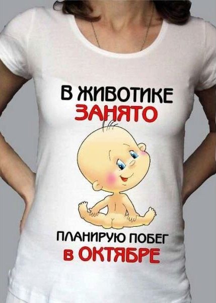 T-shirt with the words "I plan to escape!". Such an inscription is often supplemented even by the name of the month in which the birth of a child is expected, for example, “I plan to escape in August!”. Sometimes a picture is added depicting the time of year when the baby should be born. The inscription is often performed against the image of a peeping baby with sly eyes.