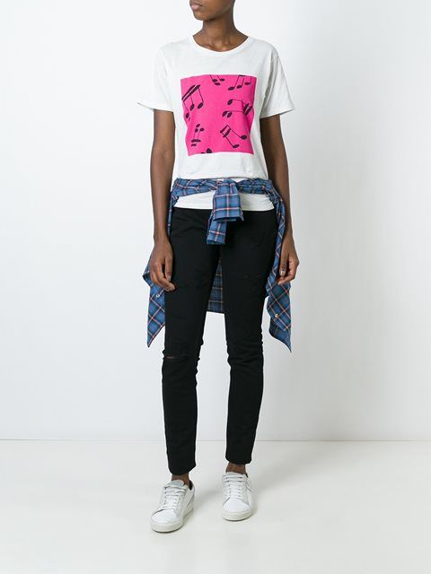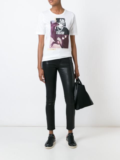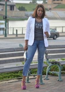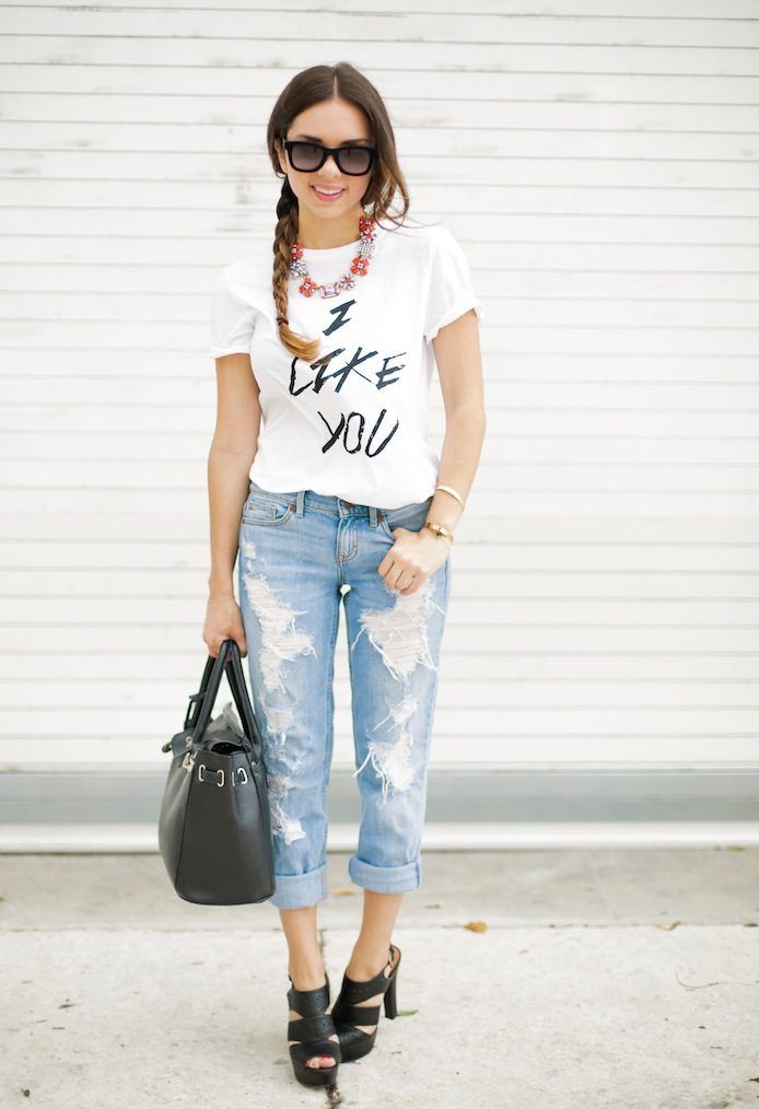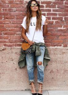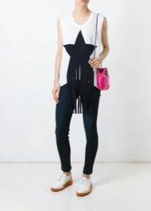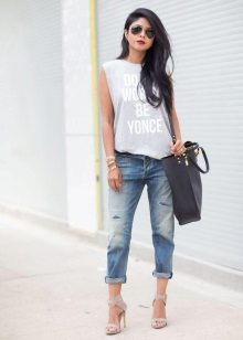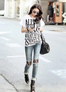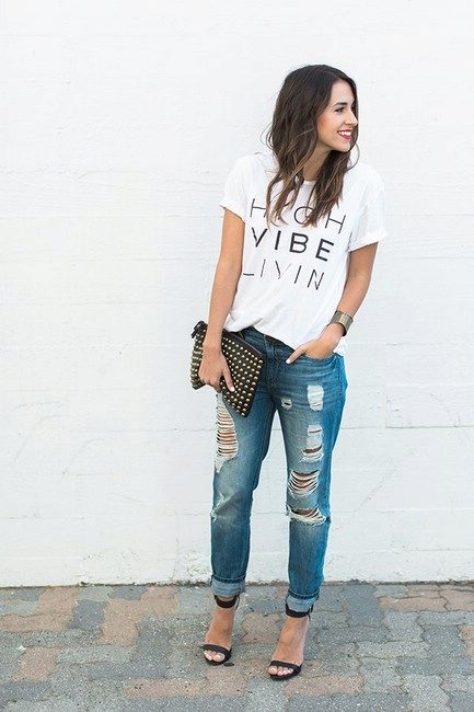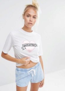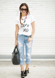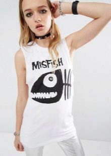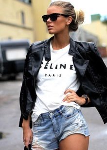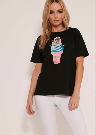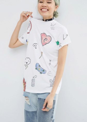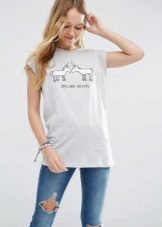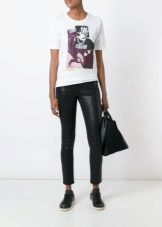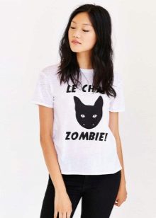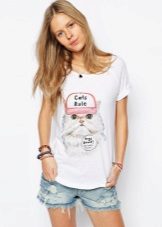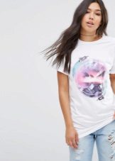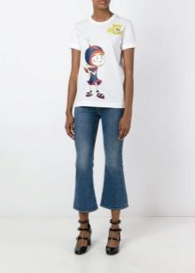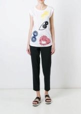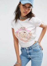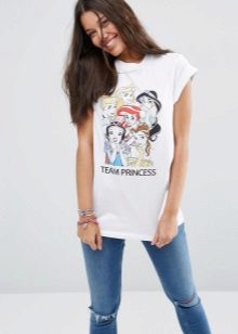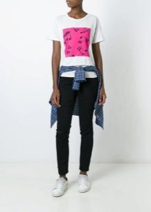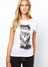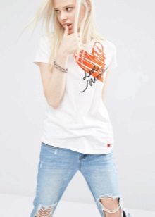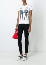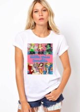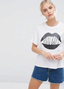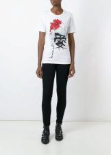 White t-shirts with inscriptions or prints are indispensable in the wardrobe of the modern fashionable woman. It will complement any casual look, you can wear them to a party, a club or a date. She looks very laconic and stylish, but a bright print adds a highlight to the image.