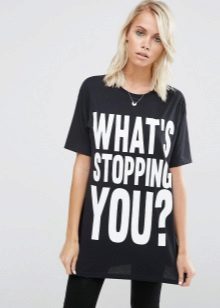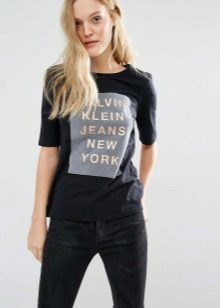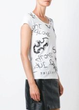 Most often, a T-shirt with a text print is an interesting detail of the image that perfectly complements everyday bows. However, it is also suitable for a fashionable party or a date with a skirt or stylish trousers.