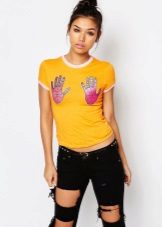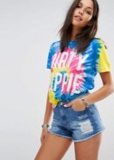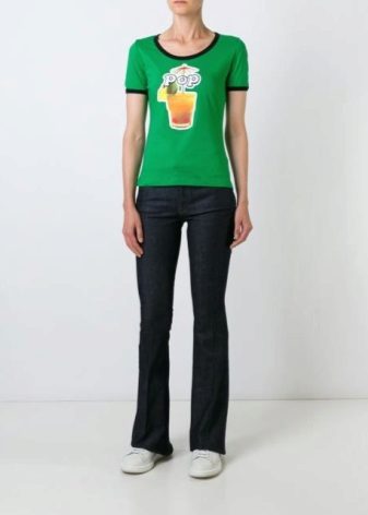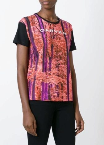Multicolored. In addition to basic neutral T-shirts, multi-colored T-shirts with interesting prints are also in demand. They are more binding, so not every woman of fashion will decide to include them in your wardrobe. Wear them best with sleek skirts or jeans. As for color, give preference to blue, pink, green or yellow. They look bright and interesting.