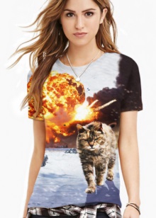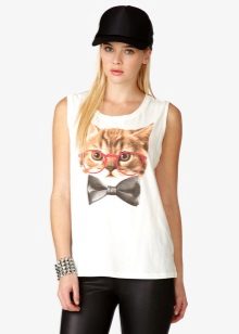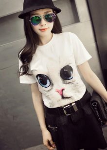 Pictures of a mystical black cat, eyes or cat faces, images of kittens or a cat pair are popular. As modern technologies allow to apply 3D images, volumetric photos of fluffy cats on a T-shirt look especially impressive.