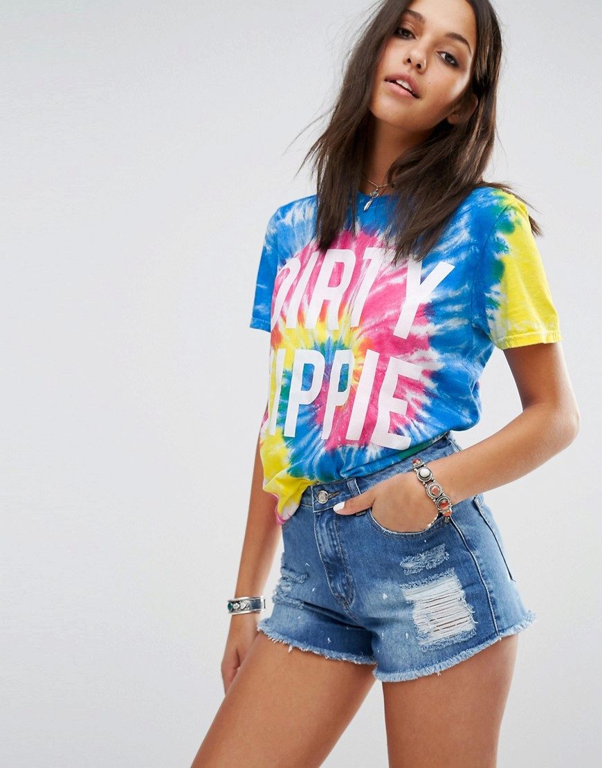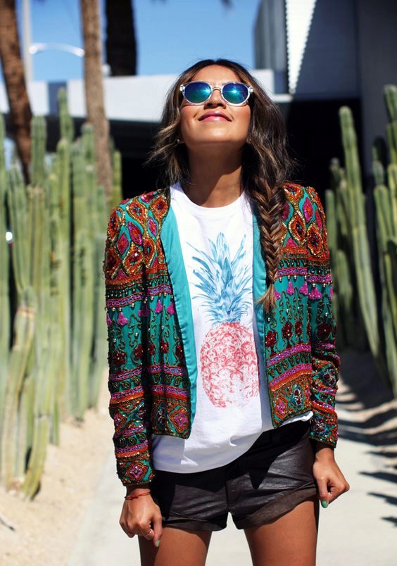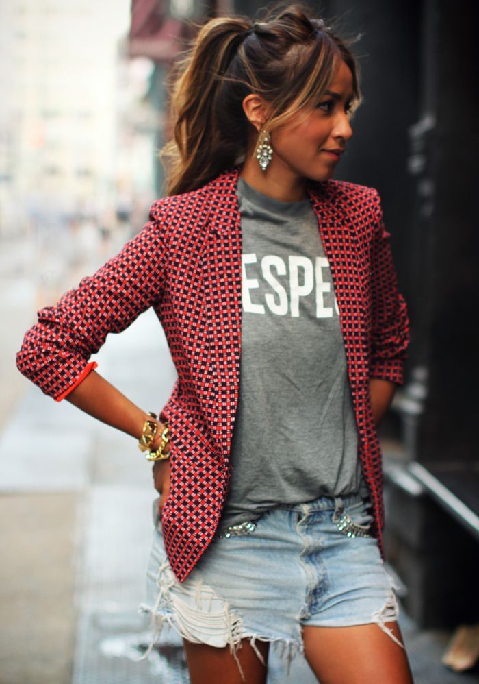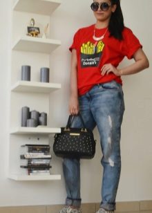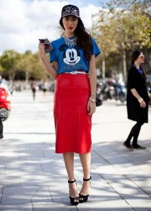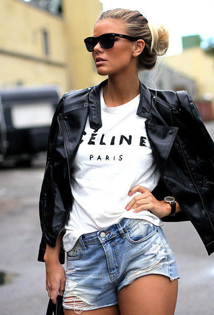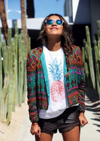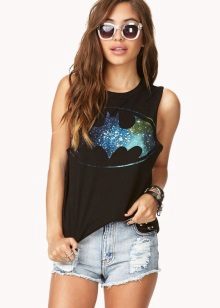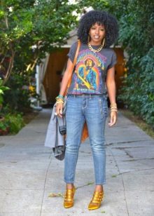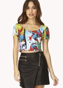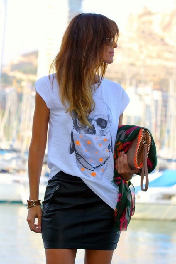 If you are going to a party, there is nothing like a bright print T-shirt! You can wear it with short shorts or jeans. A stylish miniskirt is also appropriate. Add a blazer or a leather jacket. Do not forget about high-heeled shoes, a small clutch and eye-catching jewelry that will help you to be the center of attention all evening.