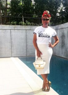 - If you go on a date, look at this delicate and feminine image. Laconic white T-shirt with the inscription, midi-skirt with floral print, white handbag and berry sandals with lacing. The image is complemented by sunglasses. You will look perfect!