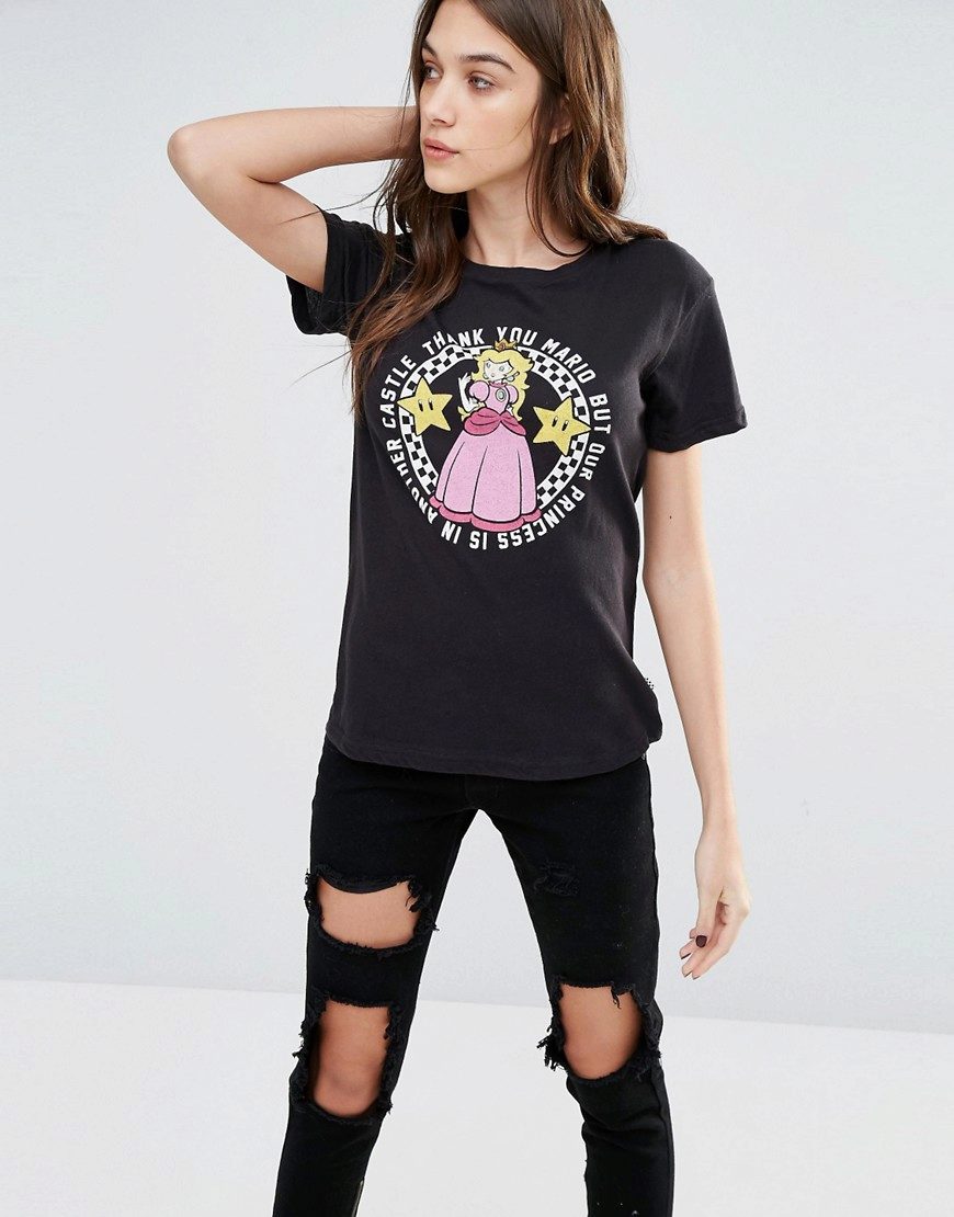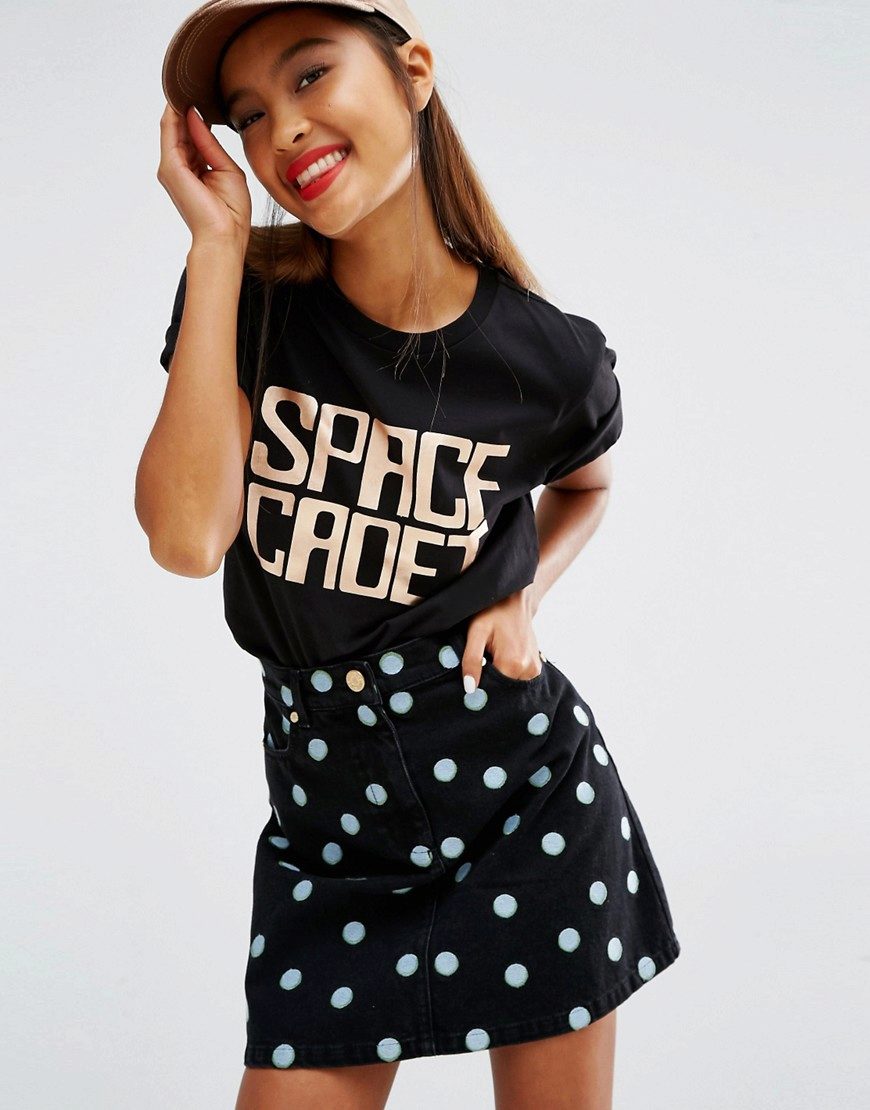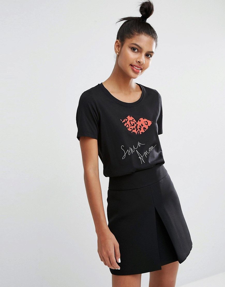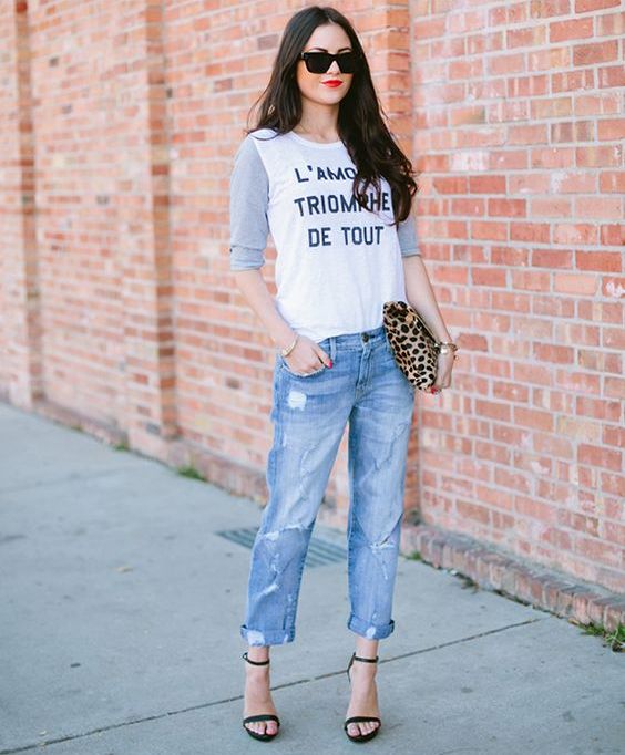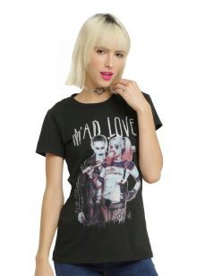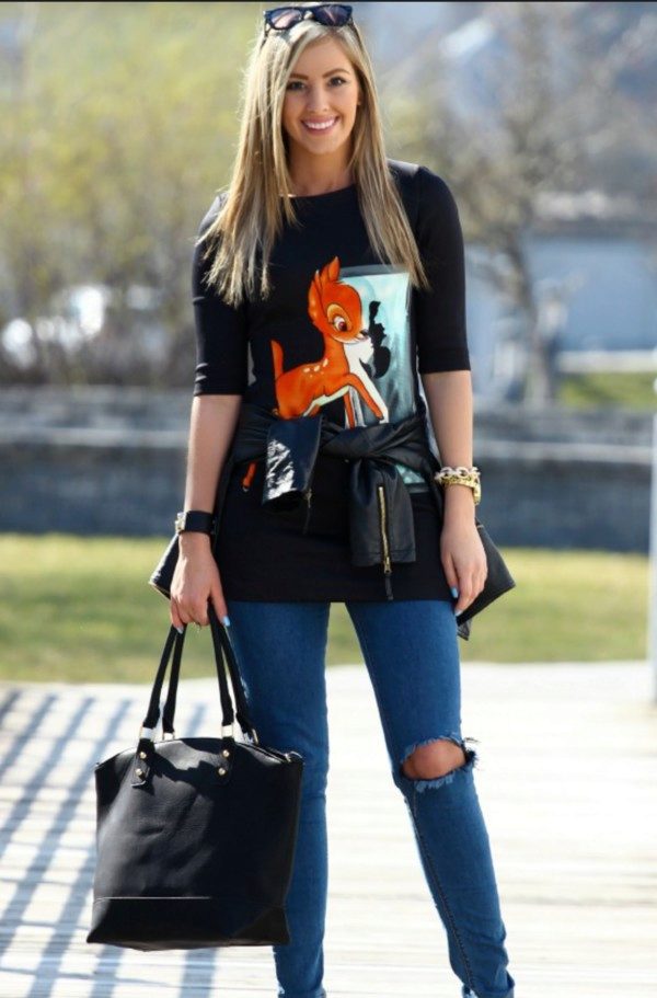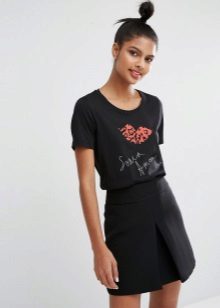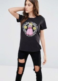 Black t-shirts with prints are no less interesting than white ones. They can be worn for a walk, meeting with friends or put on shopping. Pick the right accessories for it, and feel free to go to a party. Black color adds a highlight to the image and makes your image fashionable and elegant.