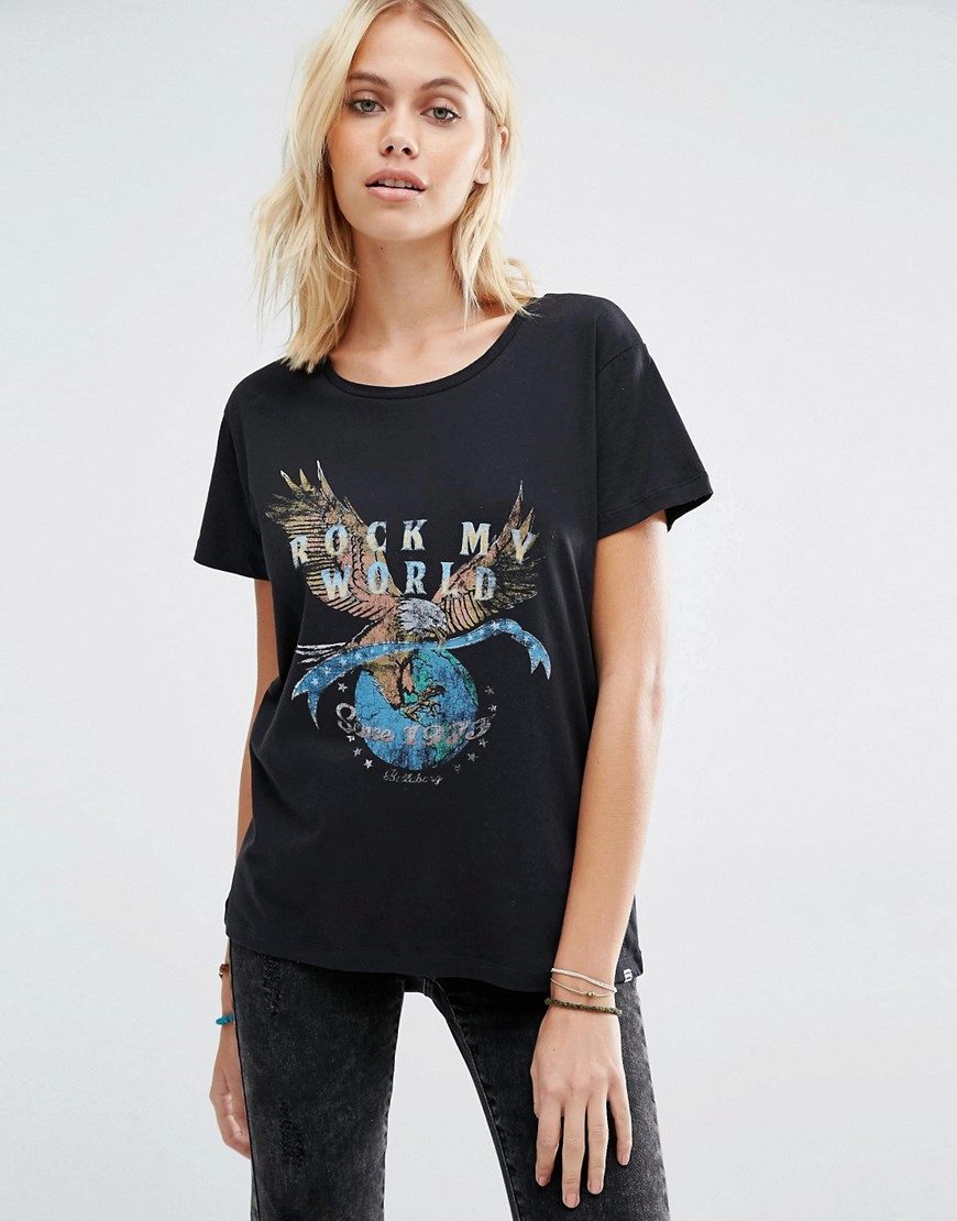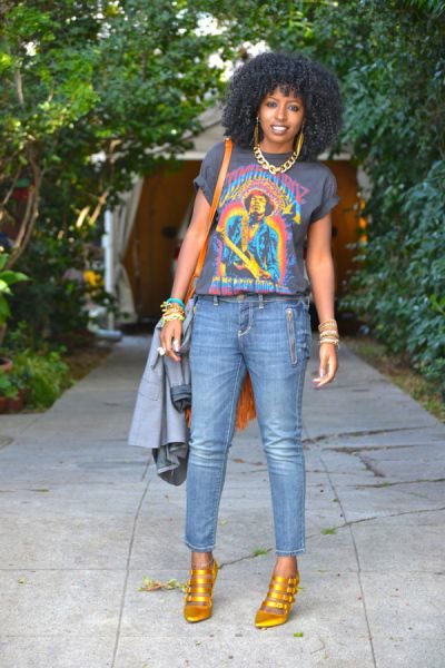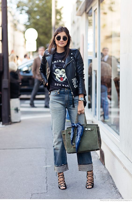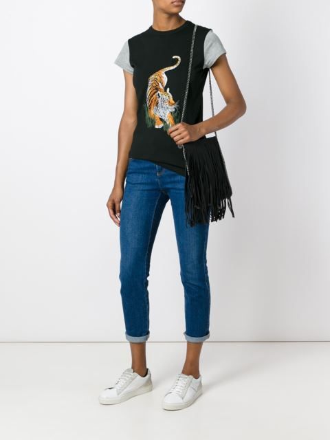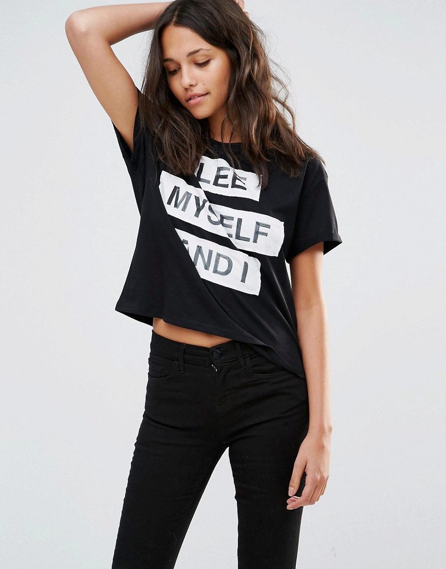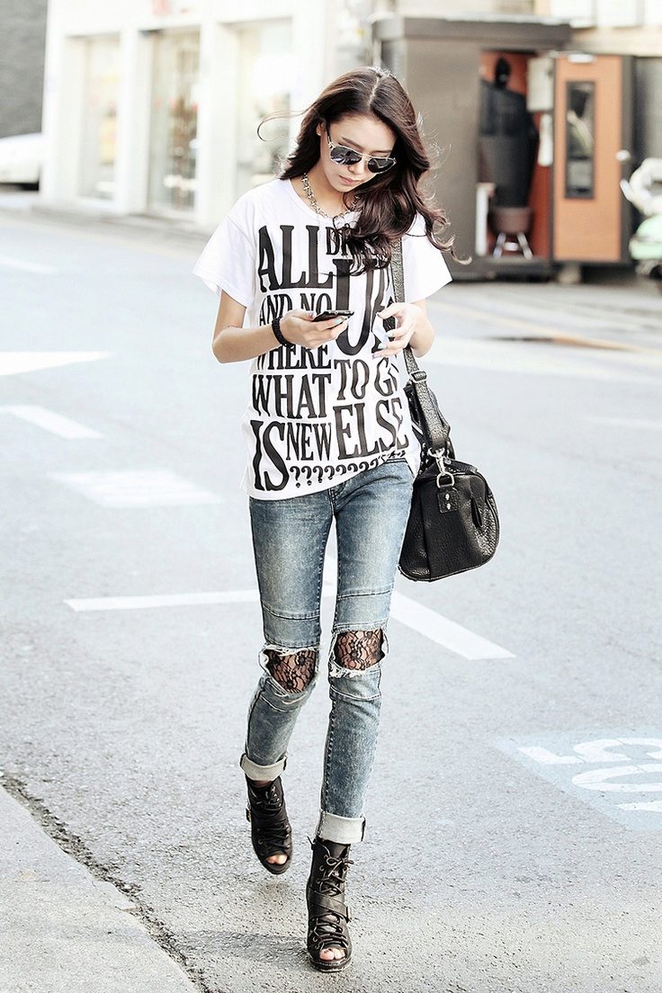 Black t-shirts with prints are no less interesting than white ones. They can be worn for a walk, meeting with friends or put on shopping. Pick the right accessories for it, and feel free to go to a party. Black color adds a highlight to the image and makes your image fashionable and elegant.