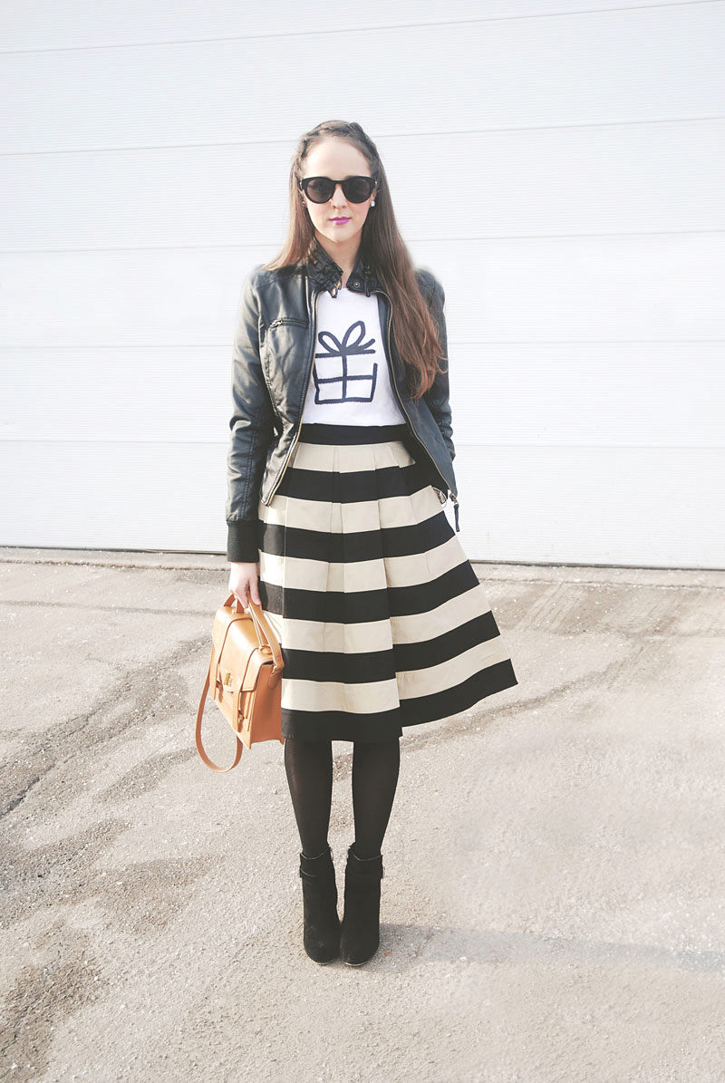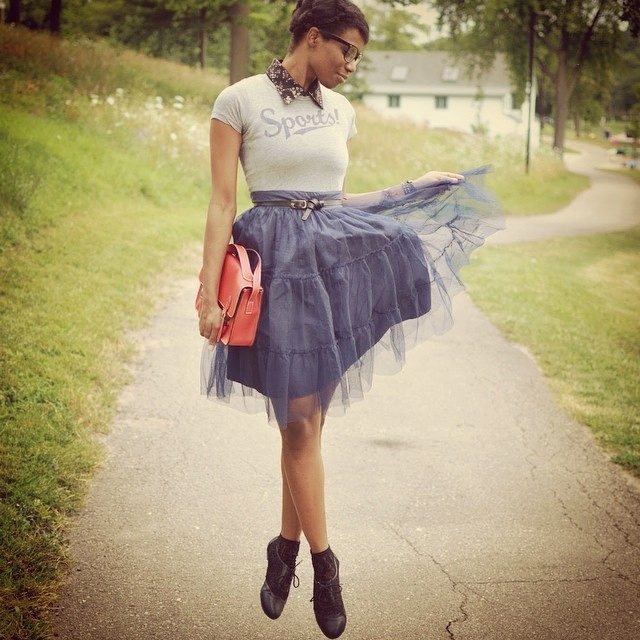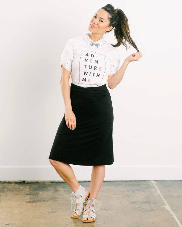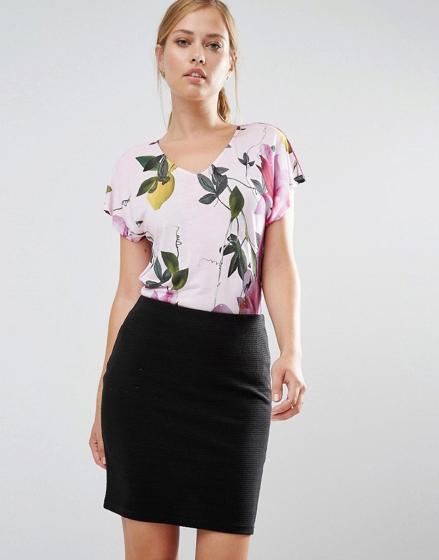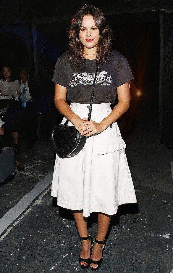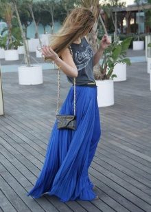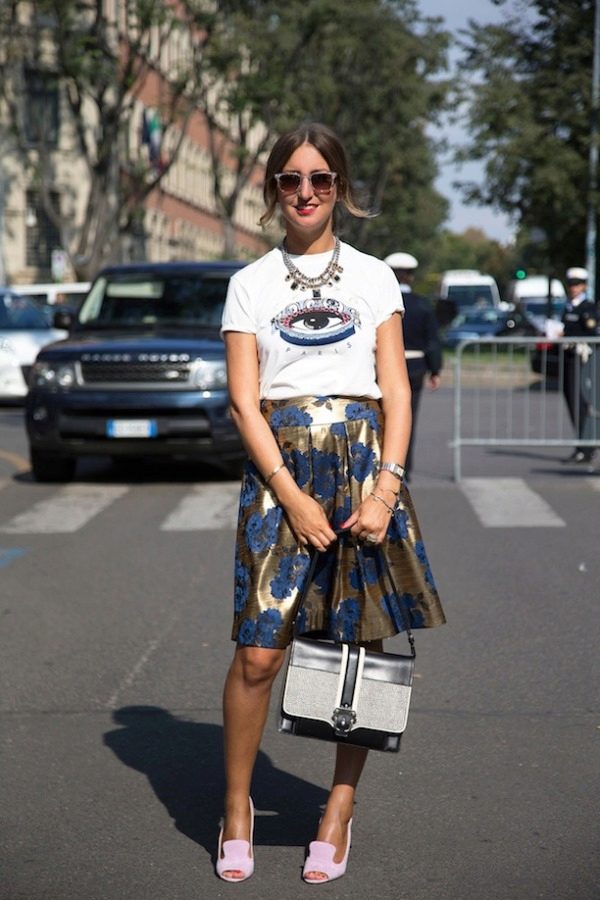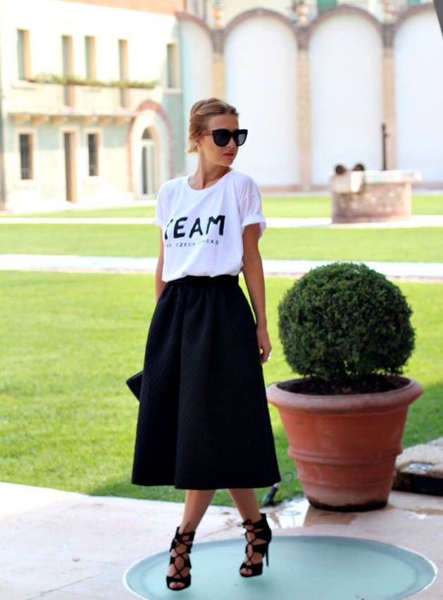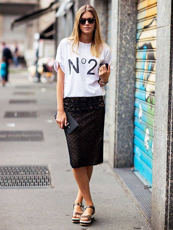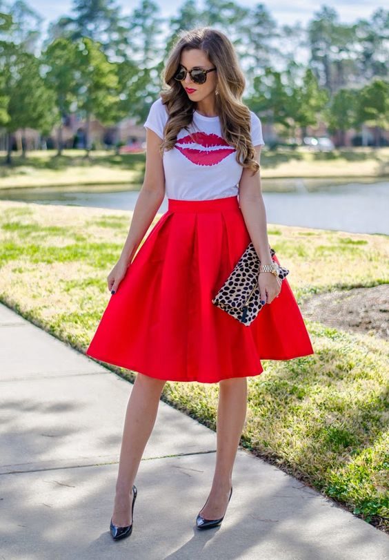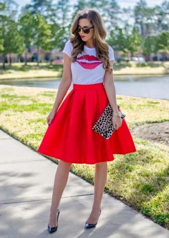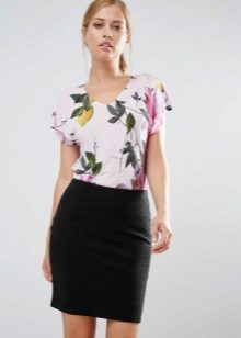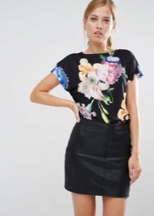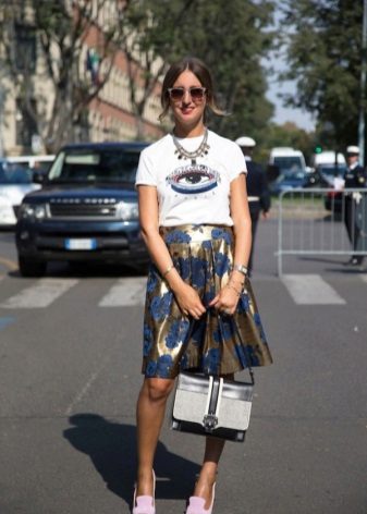 T-shirt with a gentle print in combination with a beautiful skirt is perfect for a romantic date.