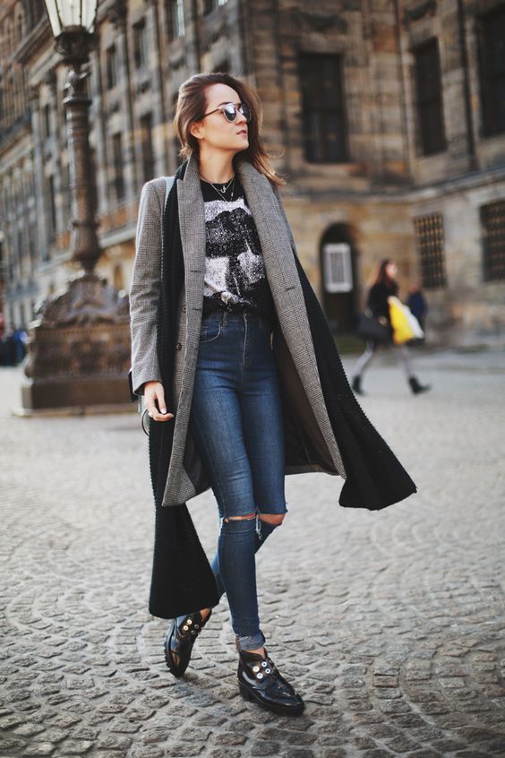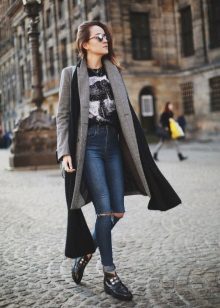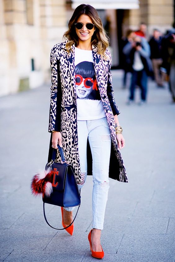 - Fashionable look for work that will appeal to creative girls. Blonde skinny, a white T-shirt with a portrait and a long coat with an animal print. The image is complemented by a stylish bag with fur charms and red boats.The red color helps to place accents in the image, we also see it on the T-shirt and on the bag.