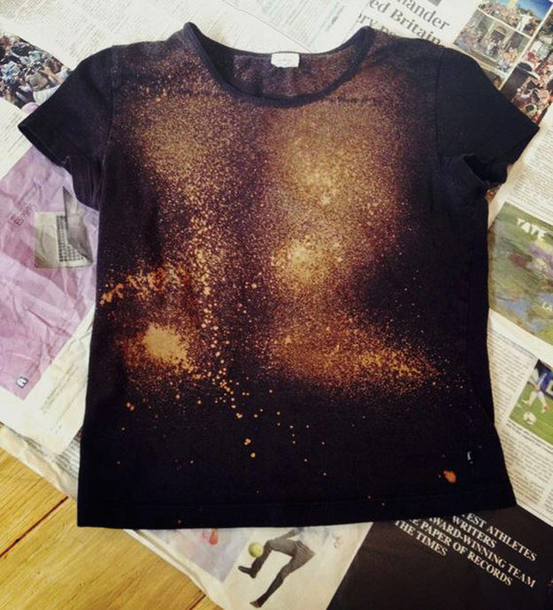Spread the shirt on old newspapers and spray bleach on it. Then pour its remains from the bottle, rinse the bottle and pour metallic paint diluted with water in the ratio 1: 2. Spray the mixture to a t-shirt.