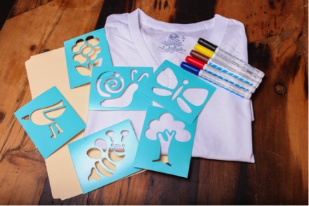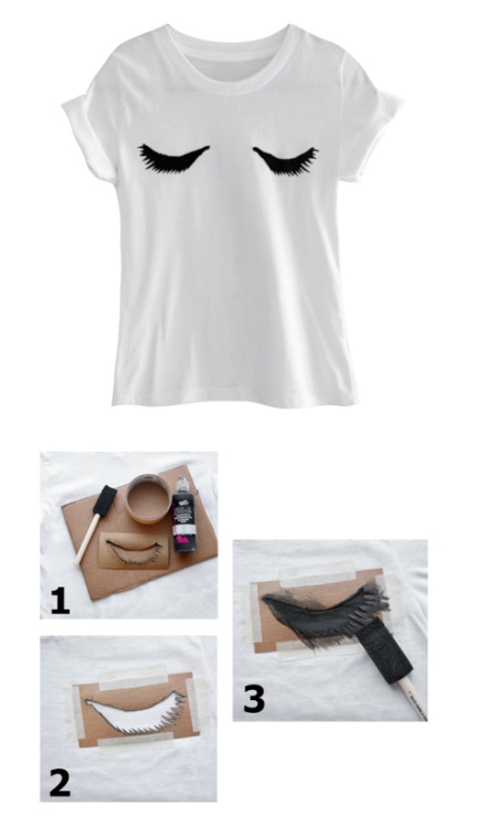 Take a white T-shirt, a piece of cardboard from which you will cut out a stencil, a sponge and black paint. Attach the cardboard stencil to the T-shirt and apply paint using a sponge. Unusual and stylish print is ready!