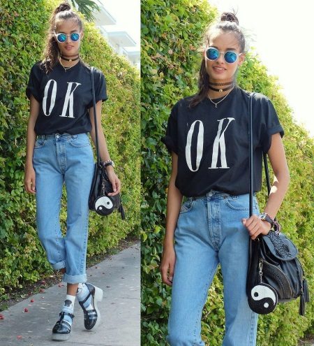 - Stylish and at the same time concise image for every day. Blue mom-jeans, black T-shirt with inscription, rubber sandals on tractor soles. Details are attached to the image - socks with a print, a few chokers around the neck, bracelets and sunglasses.