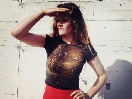 For a galactic print, you need not a white, but a black T-shirt. Also, take bleach, metallic paint colors, a brush, and an empty spray bottle.
