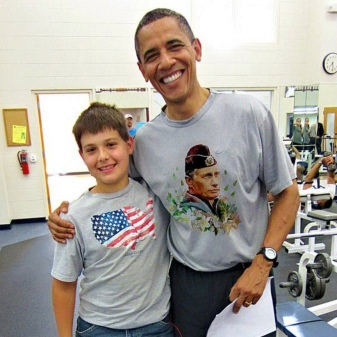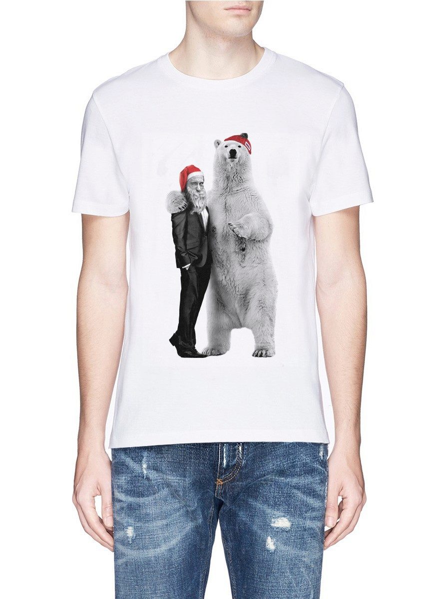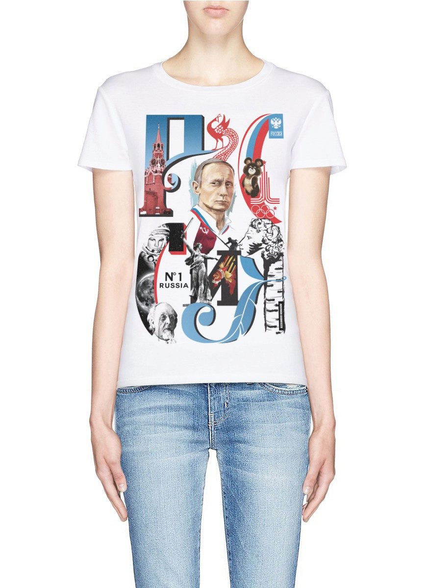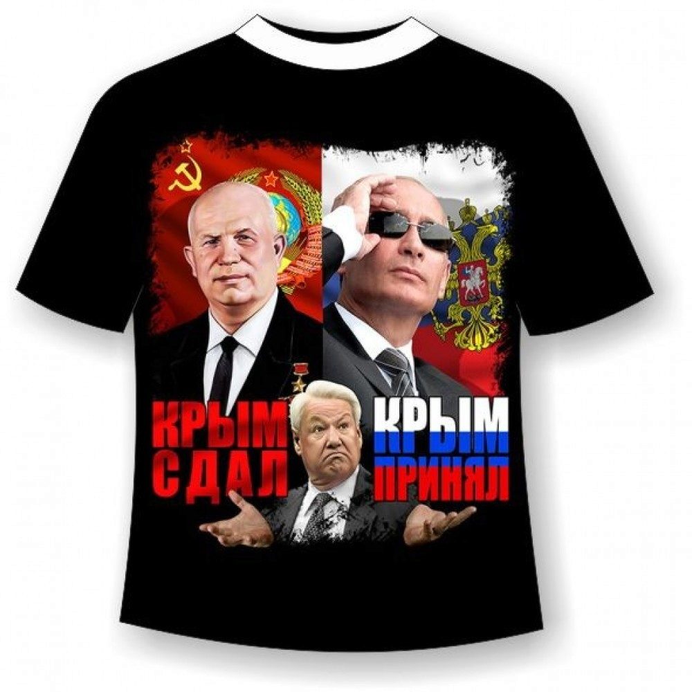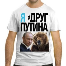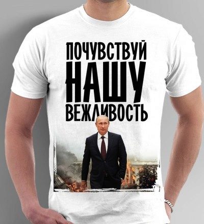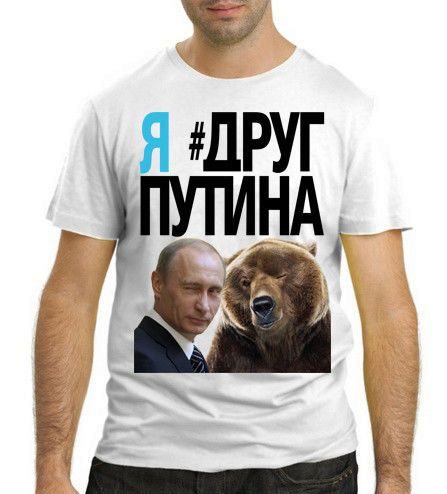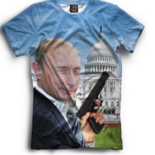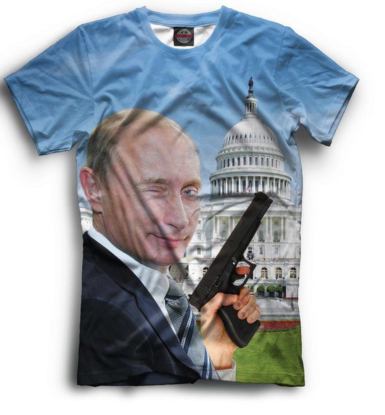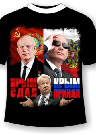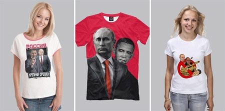 Interesting t-shirts with the image of the Russian and American presidents, hinting at the superiority of the first. These can be photos, humorous sketches expressing the relations of these two countries.