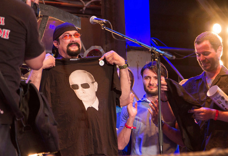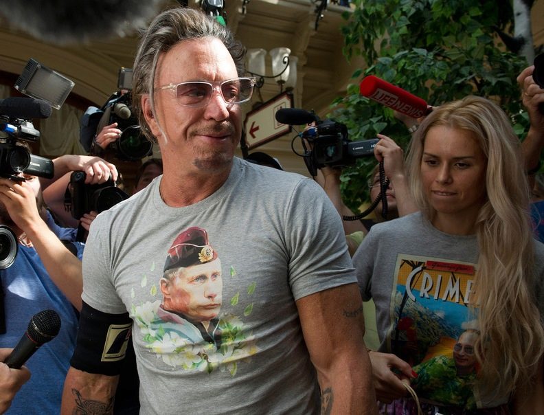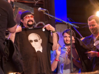 For example, Mickey Rourke wore a T-shirt with the Russian president when he arrived in Moscow. Steven Seagal also once tried on a T-shirt with the image of Putin.