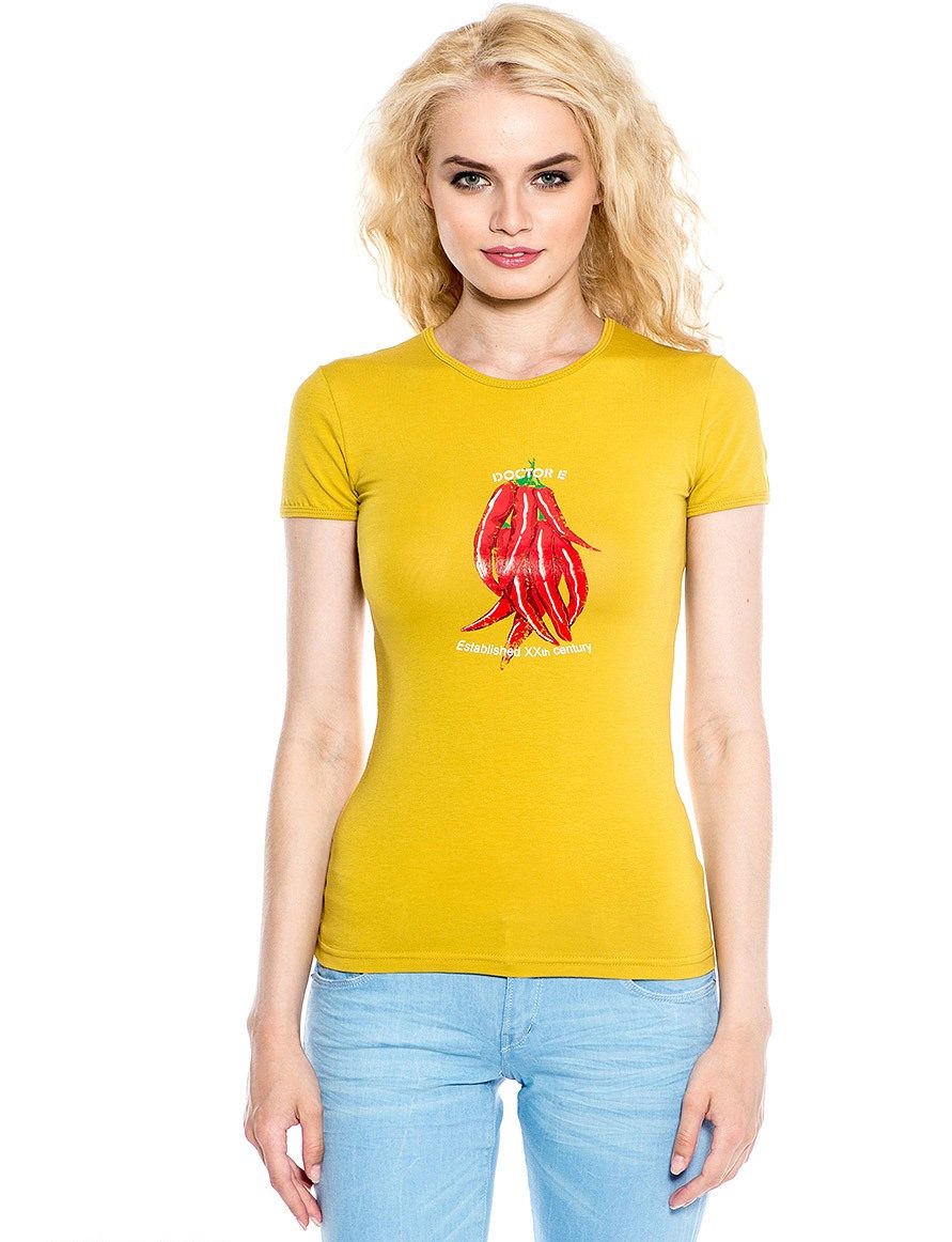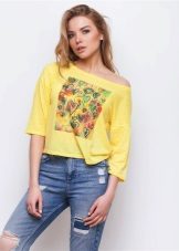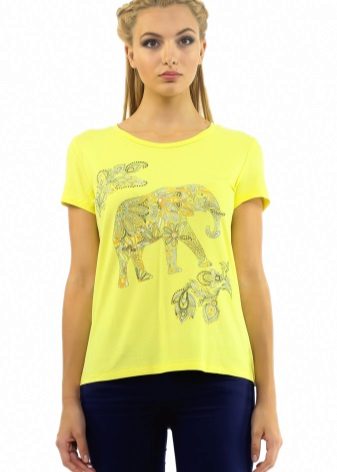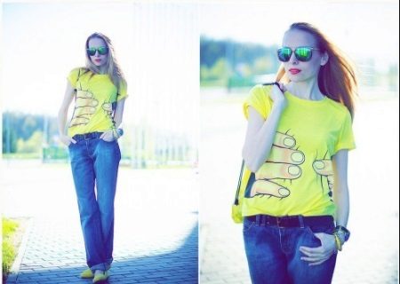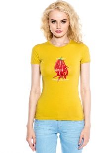 Even without any finishing, the yellow T-shirt looks attractive, positive and joyful. However, an interesting decor, contrasting accent or intricate print will help to emphasize the positive external qualities of T-shirts in yellow.