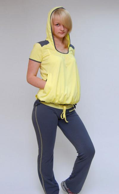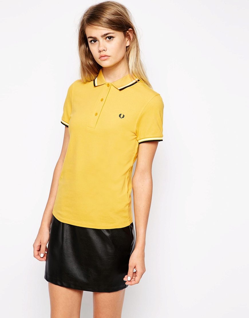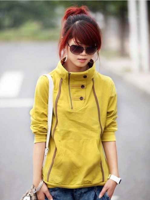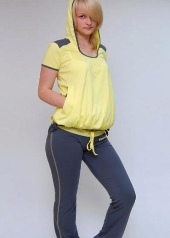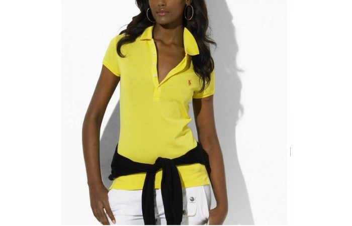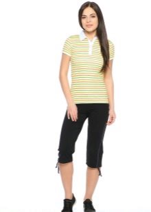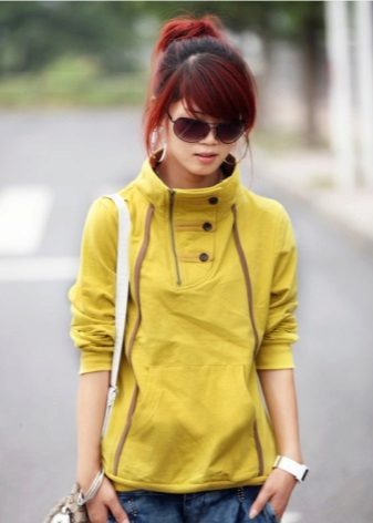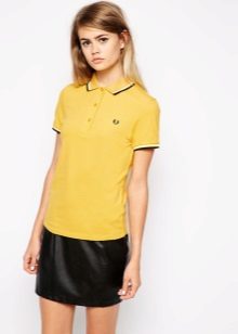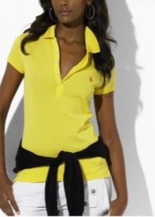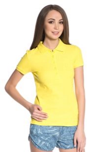 - The sporty style of yellow hooded t-shirts or polo models includes a combination of such t-shirts with sporty shorts, skirts or leggings. Yellow mono polo also looks good with jeans, solid breeches in a free cut or narrowed trousers.