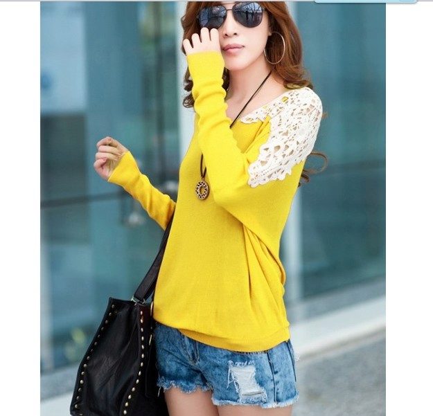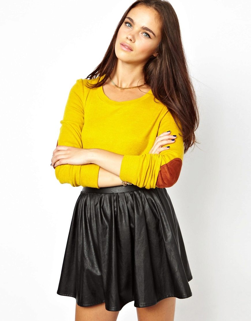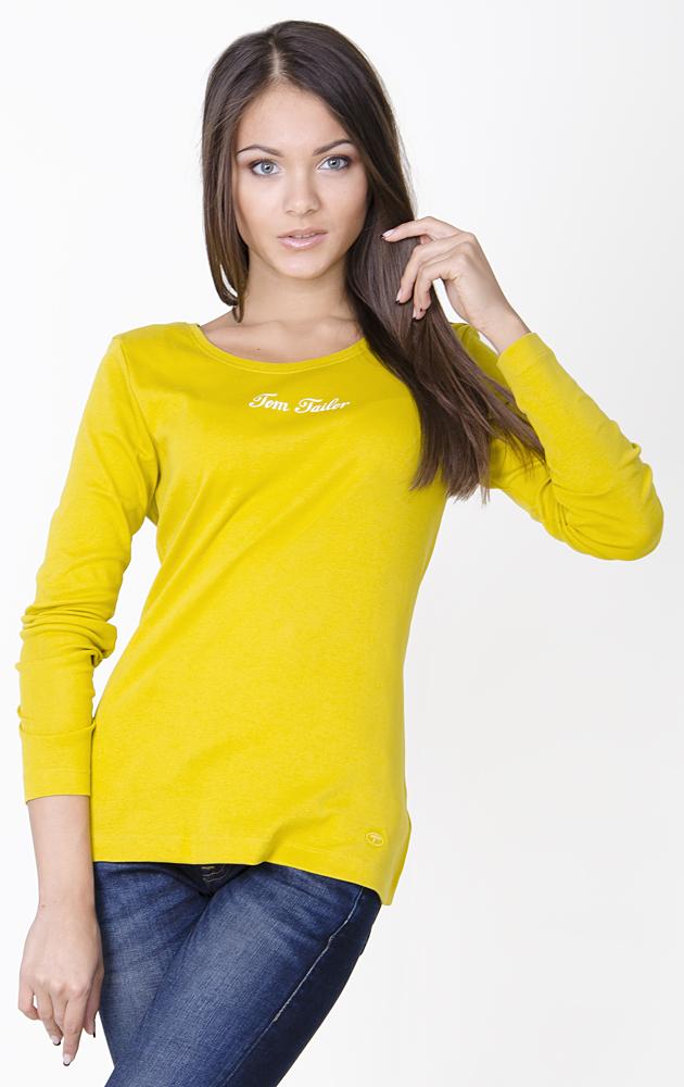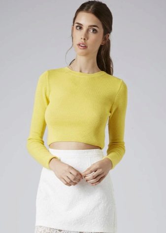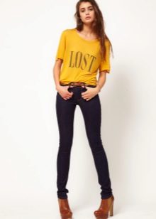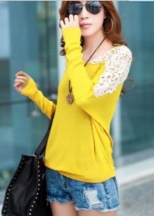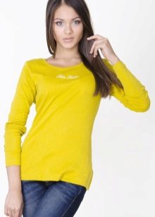 - A yellow long-sleeved T-shirt in demand for demi-season should be combined with casual pants and skirts. Also, such a T-shirt looks good, complete with a thick sundress. From accessories it is best to pick up black shoes and a black handbag over your shoulder.