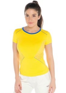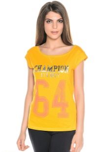 Women's yellow t-shirts are represented by a rather extensive assortment. They are distinguished by their silhouette (there are both fitting models and loose products), a cut (along with straight lines, asymmetrical T-shirts can be found) and different variations of sleeves.