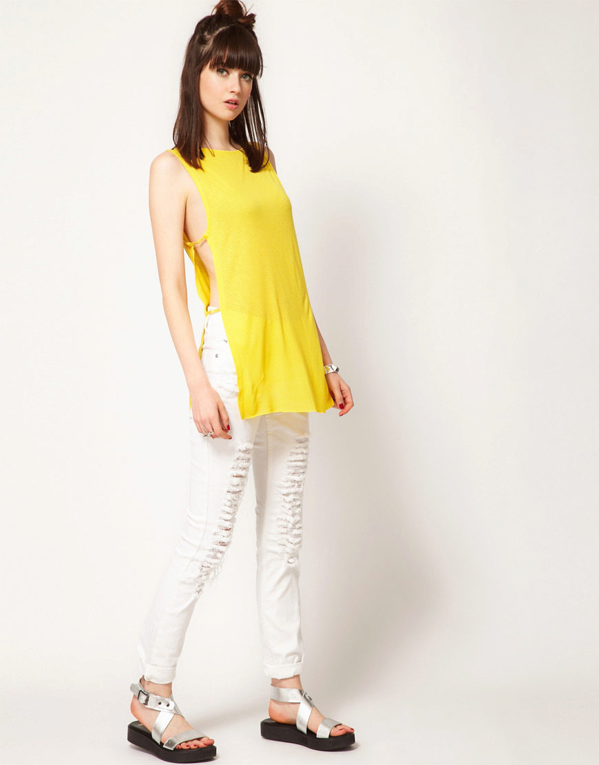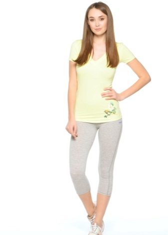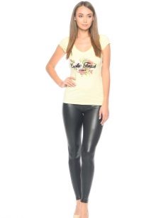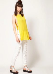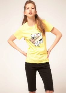 Sunny t-shirt helps to emphasize the taste and personality. A yellow sleeveless T-shirt can be called a stylish youth option for a summer walk. Especially if it is decorated with an interesting print and supplemented with black leggings.