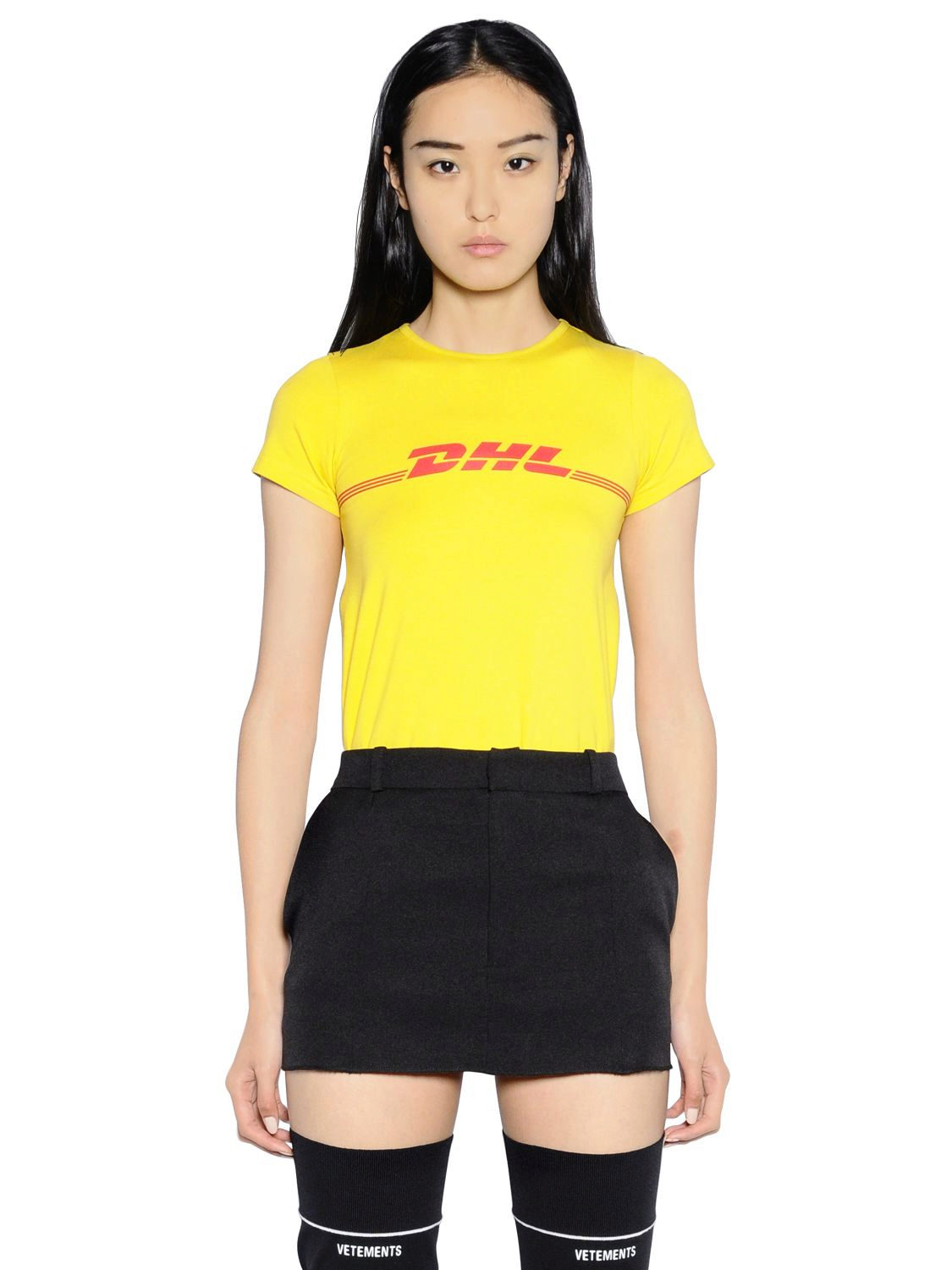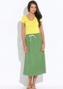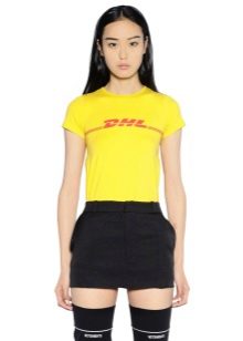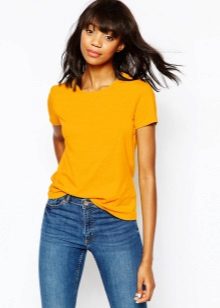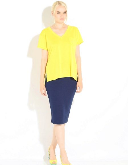 - A monochromatic yellow t-shirt with short sleeves combines well with a narrowed skirt, allowing you to create a stylish and fresh set for the office. Supplement such an ensemble is shoes with high heels and a small bag.