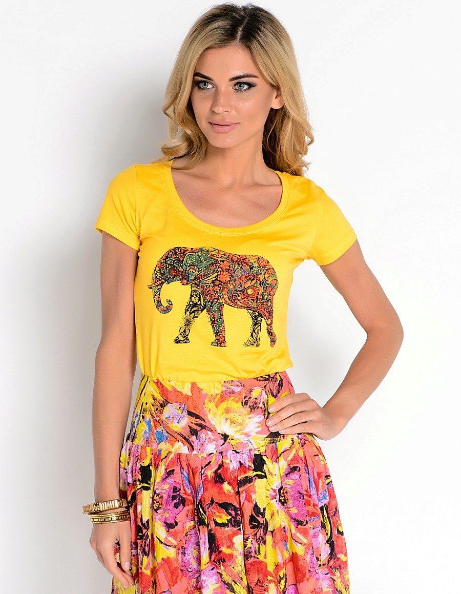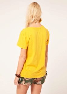 One of the most sought-after are yellow T-shirts with inscriptions in black, purple, blue and other contrasting colors. Floral print, not losing popularity for many years, on a yellow background T-shirts are often represented by red, white, light green or black elements. Striped print presented on a yellow background with a wide white stripes t-shirt is no less fashionable today. Also in demand are yellow animal t-shirts.