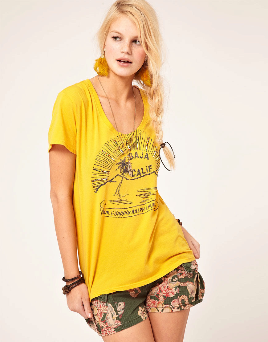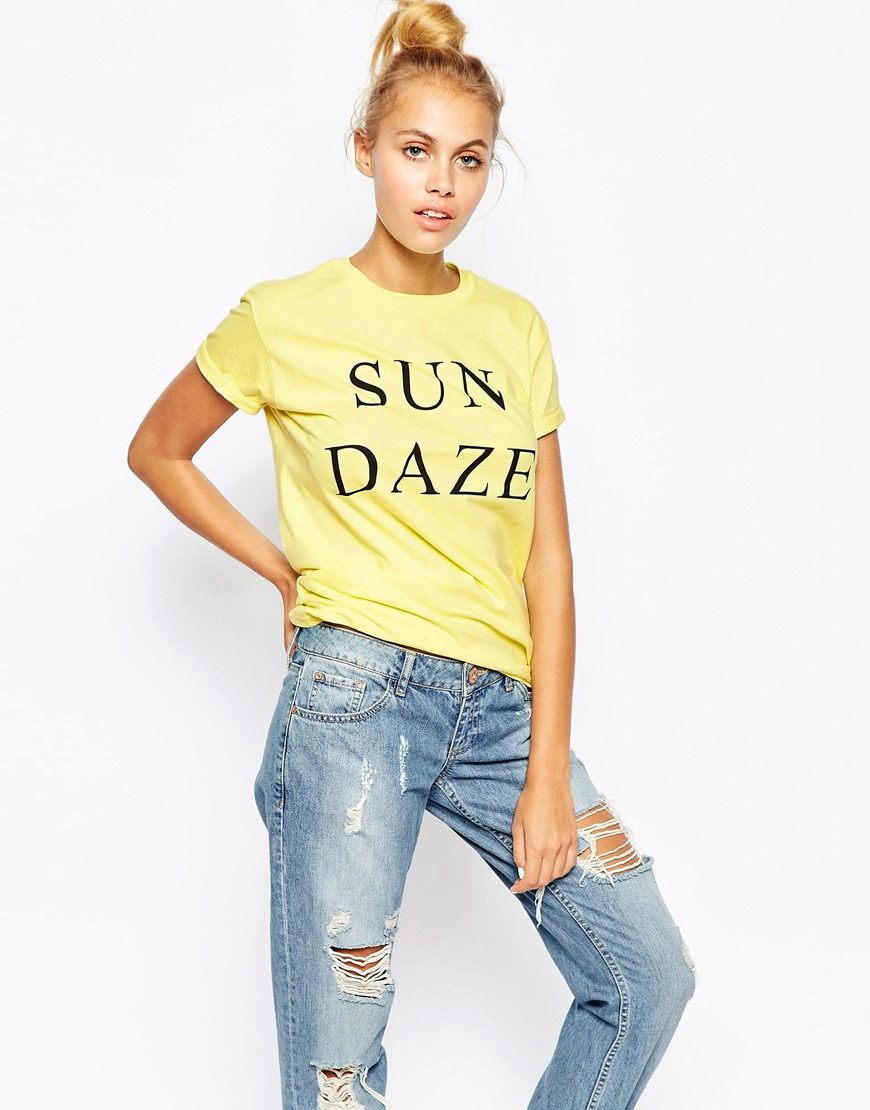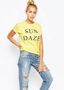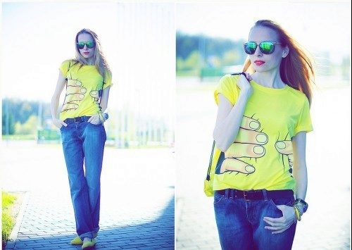 One more casual set with a yellow T-shirt, decorated with eye-catching pattern, can be created with straight jeans. In such an ensemble, blue denim and yellow top color look great together. The set can be supplemented with yellow ballet shoes, a light shoulder bag, sunglasses and several bracelets, among which one must be bright yellow.