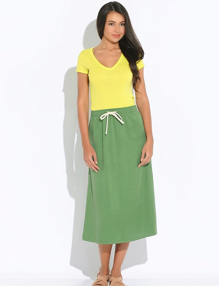 Yellow-blue combination looks gorgeous in a more elegant version. Wear a bright yellow mono-colored short-sleeved t-shirt with a full blue flared midi skirt.Complete the look with leather black accessories - a thin strap, elegant sandals and a small rectangular handbag. From jewelery pick up a few bracelets and a delicate necklace in blue tones.