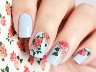 - Decoupage - These are colored napkins with a different design, which are simply glued to the nail. The base for them is the usual varnish. Excess wipes after drying are removed using a nail file, at the same time giving shape to the nails. To increase the durability of the manicure and impart a glossy shine, a transparent topcoat is used.